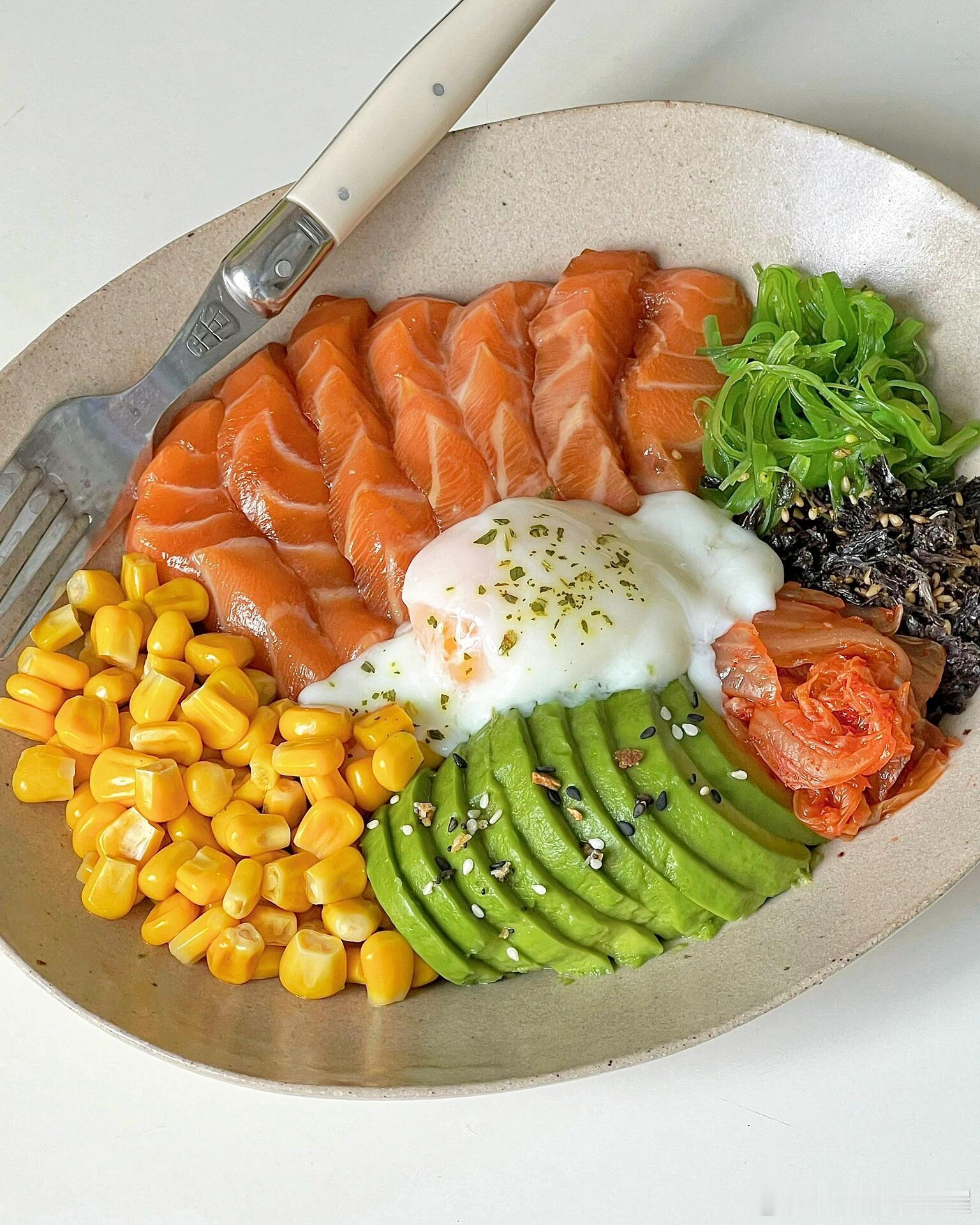 挪威三文鱼、牛油果、无菌蛋、玉米粒、泡菜、海草、拌饭海苔、糙米饭
