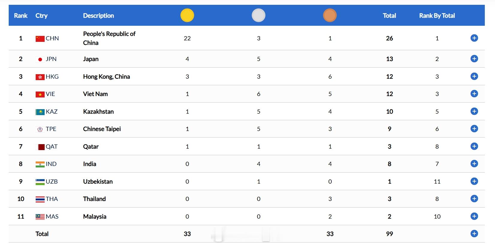 中国队收获22金3银1铜
