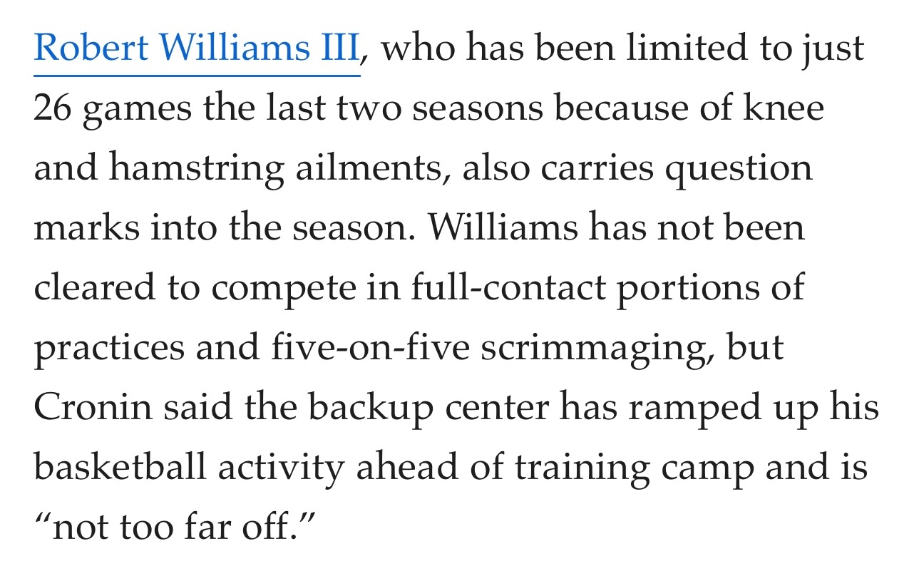 开拓者中锋罗伯特·威廉姆斯三世因膝盖和腿筋伤势,过去两个赛季仅出战26场,新赛季他的健康状况依然存疑,目前尚未获准参加训练中的全部对抗环节和五对五比赛。