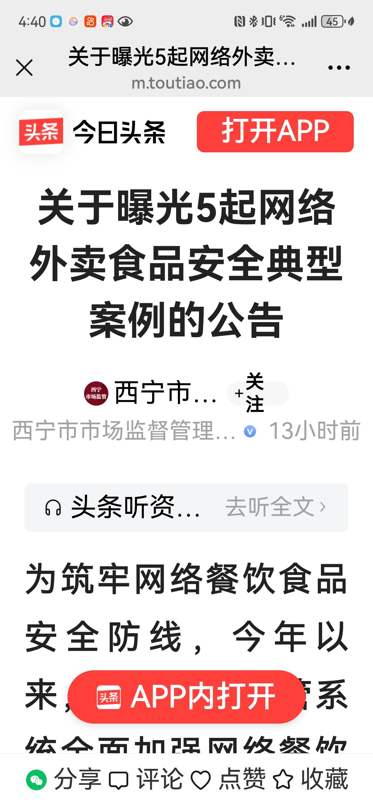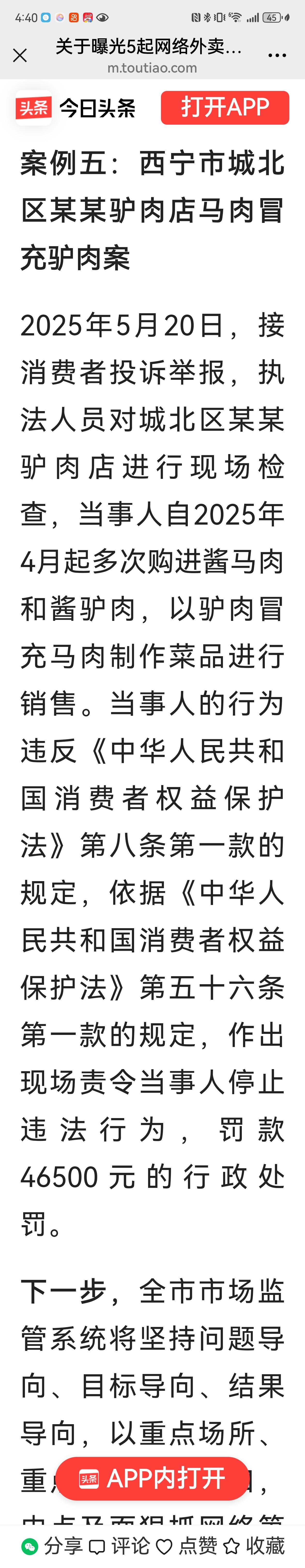 黑店!西宁一驴肉店用马肉冒充驴肉卖被罚46500元! 货架上的酱马肉摇身一变,成了价格翻倍的“酱驴肉”,这家驴肉店的偷梁换柱之计终被识破。 今年5月20日,西宁市城北区一家驴肉店因用马肉冒充驴肉销售被查处。根据西宁市市场监督管理局公布的网络外卖食品安全典型案例,该店家从今年4月起多次购进酱马肉和酱驴肉,却以驴肉名义制作菜品销售给消费者。 执法人员接到消费者投诉举报后,立即对该店进行现场检查,揭穿了这一以假乱真的把戏。该店的行为严重违反了消费者权益保护法中关于消费者知情权的规定。 依据法律规定,市场监管部门作出行政处罚决定:责令当事人立即停止违法行为,并处以46500元罚款。 此类“挂驴头卖马肉”的事件并非首例。此前,北京市朝阳区人民法院也曾通报类似案件,一餐饮店店长在驴肉火烧中掺杂马肉,最终因生产、销售伪劣产品罪被判处有期徒刑并处罚金。 市场监管部门表示,将持续保持对网络外卖食品安全违法违规行为的高压打击态势,强化行刑衔接,及时将违法线索移交公安机关。 消费者如发现食品安全问题,可拨打12315投诉举报。 秋日生活打卡季