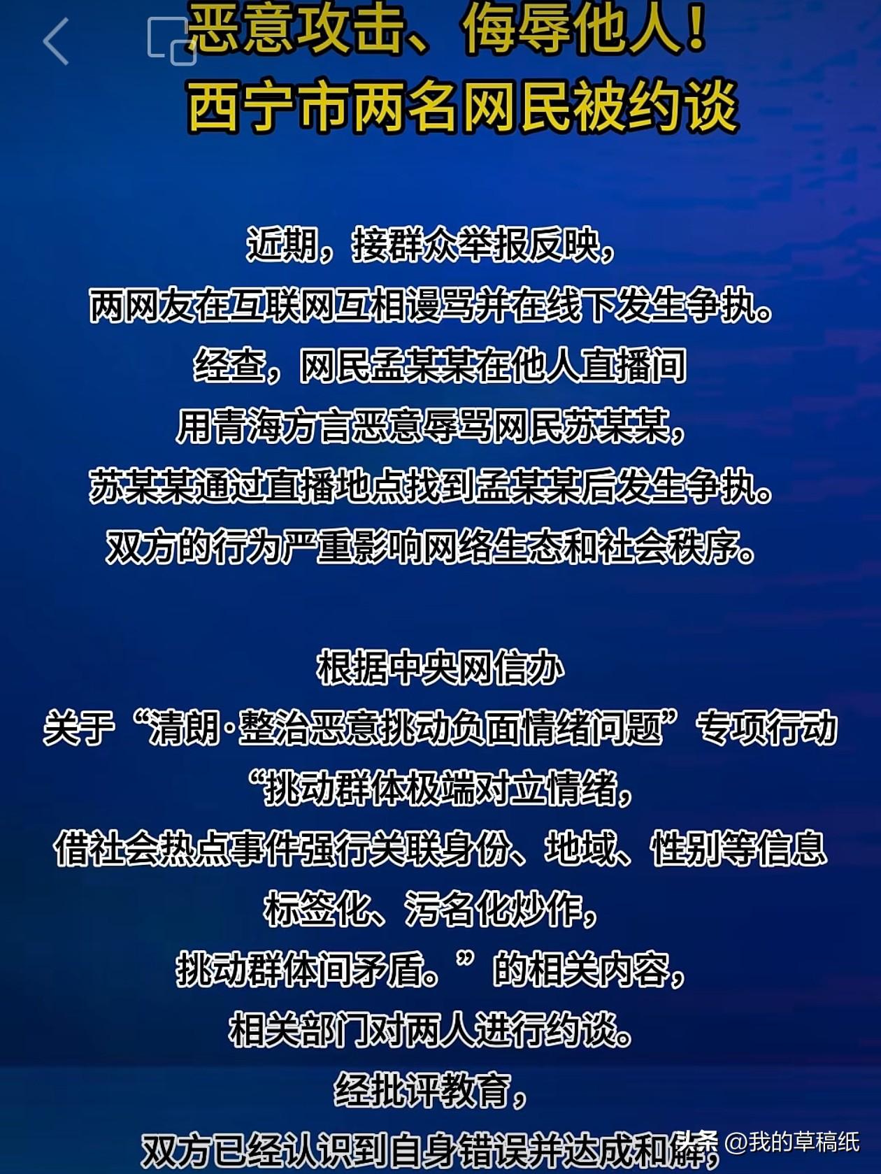 哎哟喂!西宁这两个人阿么了啥!一个网上点名点姓骂得凶,一个循线找人还真碰头了! 孟家这个鞭娃,你当直播间是咱村口场院吗?青海话骂人还直呼大名。苏家那个也不是省油的灯,顺着网线真找上门去了。俩人一见面,鼻子对鼻子眼睛对眼睛,咋,要唱一出《真假李逵》是呗? 看看官方通报,这俩人前脚网上“你TM”,后脚线下“你再试当个”。结果网信公安一叫,俩人都成鹌鹑了嘛!现在美滋滋地握手言和,早知如此何必当初? 乡亲们听我一句:网上网下都是法治社会,屏幕那头也是活生生的人。咱青海人家实在,有啥事不能好好说?非要学那炸了毛的山羊顶架哩! 网络不是撒野的地方,咱青海人要挣脸面,就要当个文明人! 秋日生活打卡季