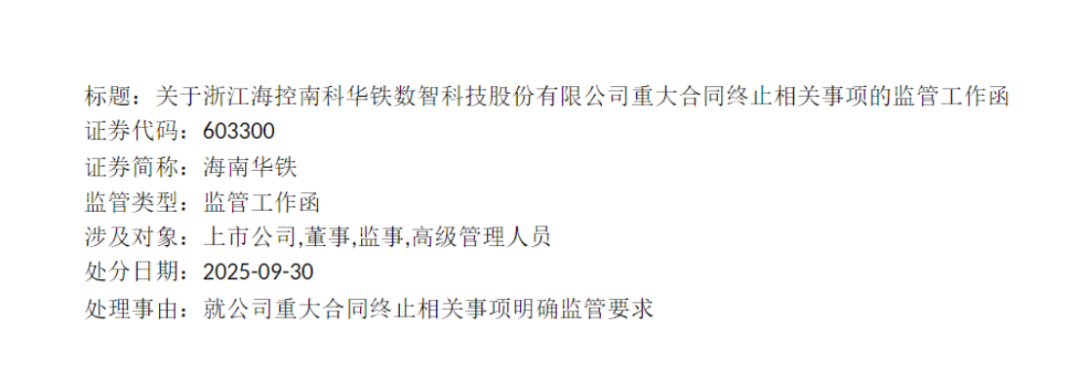 9月30日当晚,上交所对海南华铁下发监管工作函,处理事由为“就公司重大合同终止相关事项明确监管要求”,涉及对象包括上市公司、董事、监事、高级管理人员。