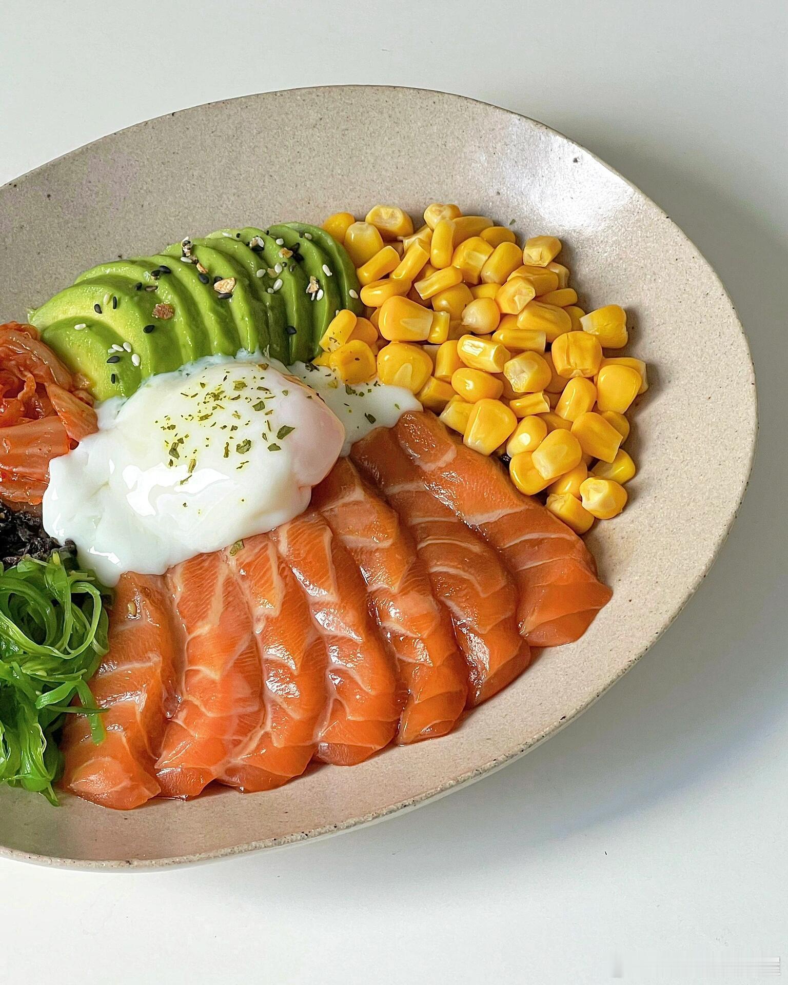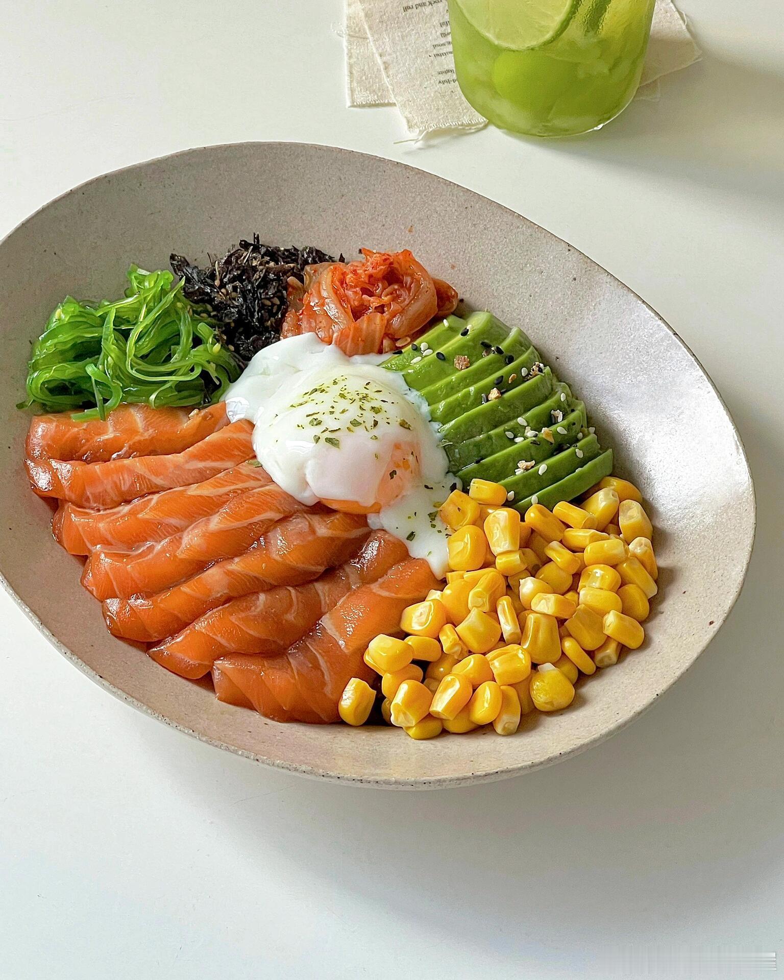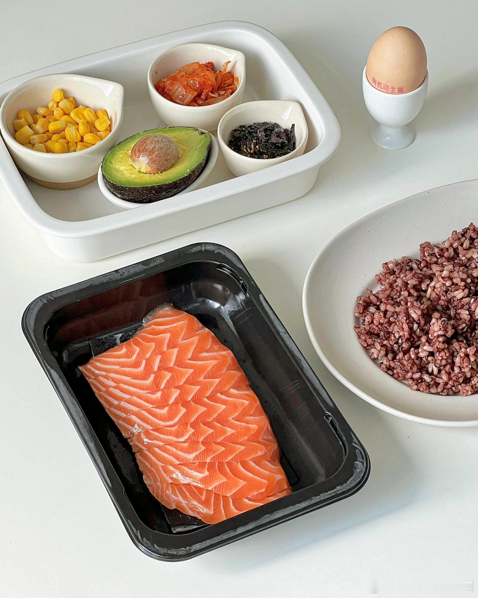 挪威三文鱼、牛油果、无菌蛋、玉米粒、泡菜、海草、拌饭海苔、糙米饭
