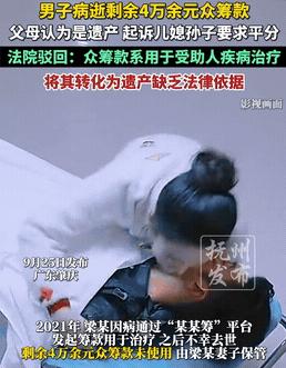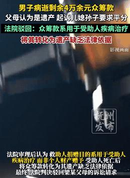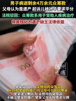 广东德庆,李先生被查出癌 症,前期治疗掏空积蓄,后续费用如无底洞。妻子在亲友建议下于发起筹款的求助,很快凑够阶段性治疗费。可李先生治疗半个多月后病逝,扣除费用还剩4万多。李先生父母要求平分,被儿媳拒绝,老两口将儿媳和俩孙辈告上法庭,经审理后诉求被驳回。 素材来源于:抚州发布 45岁的李先生感觉身体不适,去一检查,竟被确诊为癌 症。家里积攒的那点积蓄,很快就在前期的治疗中花得一干二净。 后续的化疗、靶向药等费用,就像一个无底洞,让这个本就不富裕的家庭陷入了绝境。 在亲友们的建议下,李先生的妻子想到了网络筹款。她怀着忐忑的心情,在某某上发起了求助。 她详细地说明了李先生的病情、治疗过程以及后续所需的费用,每一个字都饱含着无奈与期盼。 不少人被李先生的遭遇所打动,纷纷伸出援手。有的捐几十,有的捐几百,大家的心意汇聚成了一股强大的力量。 很快,就凑够了阶段性的治疗费用。李先生的妻子看着账户里不断增长的数字,心中燃起了一丝希望。 尽管积极治疗了半个多月,李先生的病情还是急剧恶化。最终,他还是永远地闭上了眼睛。 李先生的妻子整理各种单据,扣除医药费、住院费等费用后,账户里还剩下4万多元。她心想,这些钱虽然不多,但或许可以用来还一些之前为了治病欠下的债。 然而,李先生的父母得知此事后,却找上了门。他们认为,这4万多元是儿子的遗产,应该由他们和儿媳平分。 李先生的妻子觉得,这些钱是大家为了给丈夫治病捐的,应该按照公益捐赠来处理,怎么能算作遗产呢? 双方各执一词,争执不下。老两口见儿媳不肯妥协,竟然将儿媳和两个未成年的孙辈告上了法庭。 李先生病逝后,其父母认为剩余的4万多元是儿子遗产,应由他们和儿媳平分。儿媳则觉得这是大家为给丈夫治病捐的,应按公益捐赠处理,不算遗产。 这笔剩余众筹款到底属于什么性质,是遗产还是公益捐赠款项,她们的主张是否符合法律规定呢? 1,关于遗产的认定。 根据民法典第一千一百二十二条规定,遗产是自然人死亡时遗留的个人合法财产。这里强调的是自然人死亡时遗留的财产。 在这起事件中,剩余的4万多元众筹款,并非李先生死亡时就已经确定属于他的个人财产。 这笔钱是通过网络众筹平台,基于李先生患癌需要治疗这一特定目的,由众多爱心人士捐赠而来。 捐赠人的意图是帮助李先生治疗疾病,而不是让这笔钱成为李先生的遗产。 所以,从遗产的定义和构成要件来看,这4万多元不符合遗产的特征,不能认定为遗产。 2,公益捐赠。 根据民法典第六百五十七条规定,赠与合同是赠与人将自己的财产无偿给予受赠人,受赠人表示接受赠与的合同。 在本事件中,众多捐赠人在“某某筹”平台上看到李先生的病情和求助信息后,自愿将钱捐赠出来,这是一种赠与行为。 而且,这种赠与具有特定的公益目的,即用于李先生的癌症治疗。 当李先生病逝,治疗目的已经无法完全实现时,剩余的款项应当按照公益捐赠的初衷和性质来处理,而不是随意改变用途。 李先生的父母主张将剩余款项作为遗产平分,违背了捐赠人的意愿和公益捐赠的性质。 民法典虽然规定了继承的相关内容,但这是在符合遗产认定条件的前提下。由于剩余众筹款不属于遗产,所以不能按照继承法关于遗产分配的规定来进行平分。 李先生的妻子作为家庭的一员,在处理这笔款项时,应当遵循公益捐赠的原则,合理使用剩余资金,而不是将其据为己有或者违背捐赠人意愿进行分配。 经过一番审理,最终驳回了老两口的诉求,认定剩余的众筹款应用于公益用途。