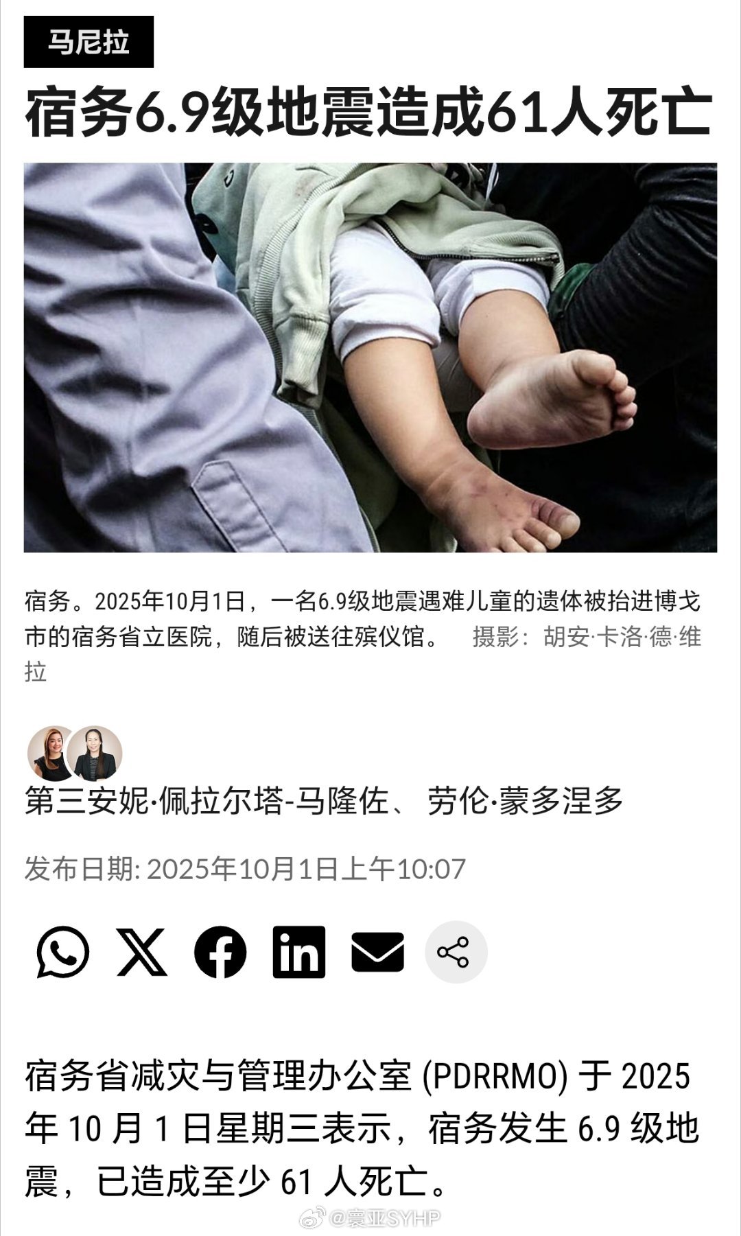 菲律宾地震61人死菲律宾宿务省减灾与管理办公室表示,宿务发生6.9级地震,已造成