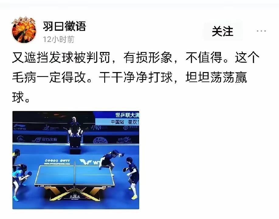 看比赛的时候,就想到一定会有黑子跳出来说事! 黑子动作真快! 什么叫又遮挡发球? 还称为这个毛病,什么毛病?鹰眼不就是被挑战的吗? 林诗栋多少次遮挡被判罚了,周恺乒超联赛一场比赛不被判罚好几次? 雨果回抛角度也很大,谁都被判罚过,王楚钦是第一次,并且是在下降过程中,被他的大脑袋挡了一下。 马继华先生也专门发文,王楚钦采访自己就说过,他是当暂停,缓和一下节奏!