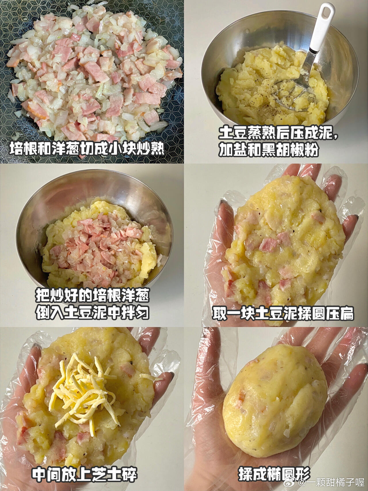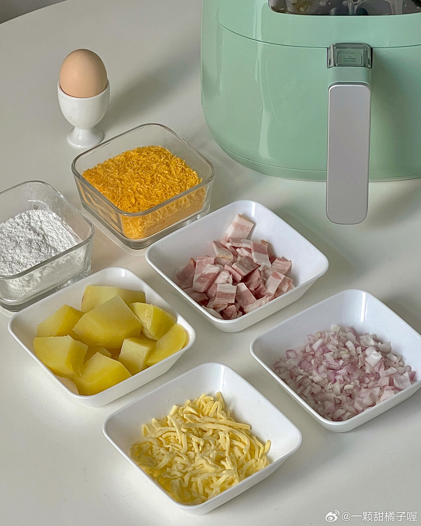 土豆、培根、洋葱、芝士碎、玉米淀粉、面包糠