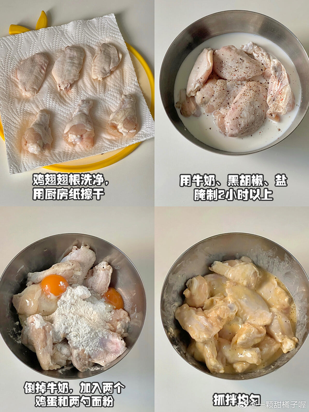 1️⃣鸡翅洗净,用厨房纸擦干,加入牛奶、黑胡椒、盐抓匀腌制1小时以上。