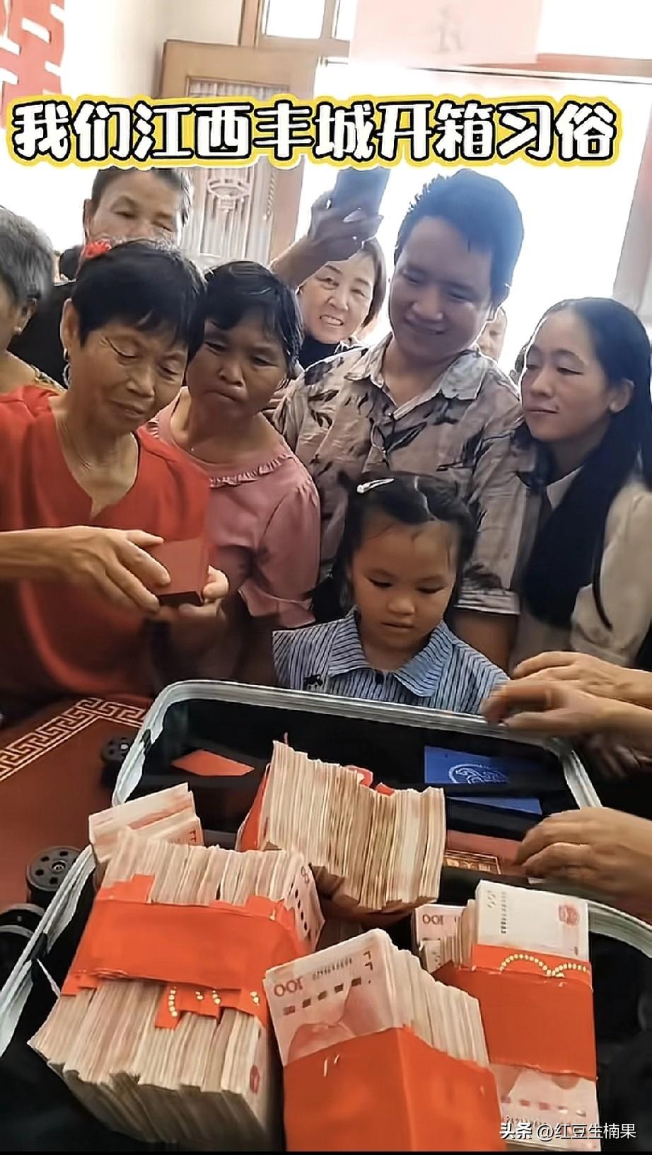 真的很开森啊!这么多的红票票,看来这些好女人必须由本来好男人来守护,千万不要外嫁。 没有办法,其它地方的男人娶不起,如果真的要娶,记得一定要女方婚检,要是不愿意婚检,要切记彩礼不能给。 你看这一大家子,看到整箱的红票票彩礼钱,那叫一个高兴啊。心里在想,“找了一个金龟婿真好,以后有花不完的钱”。