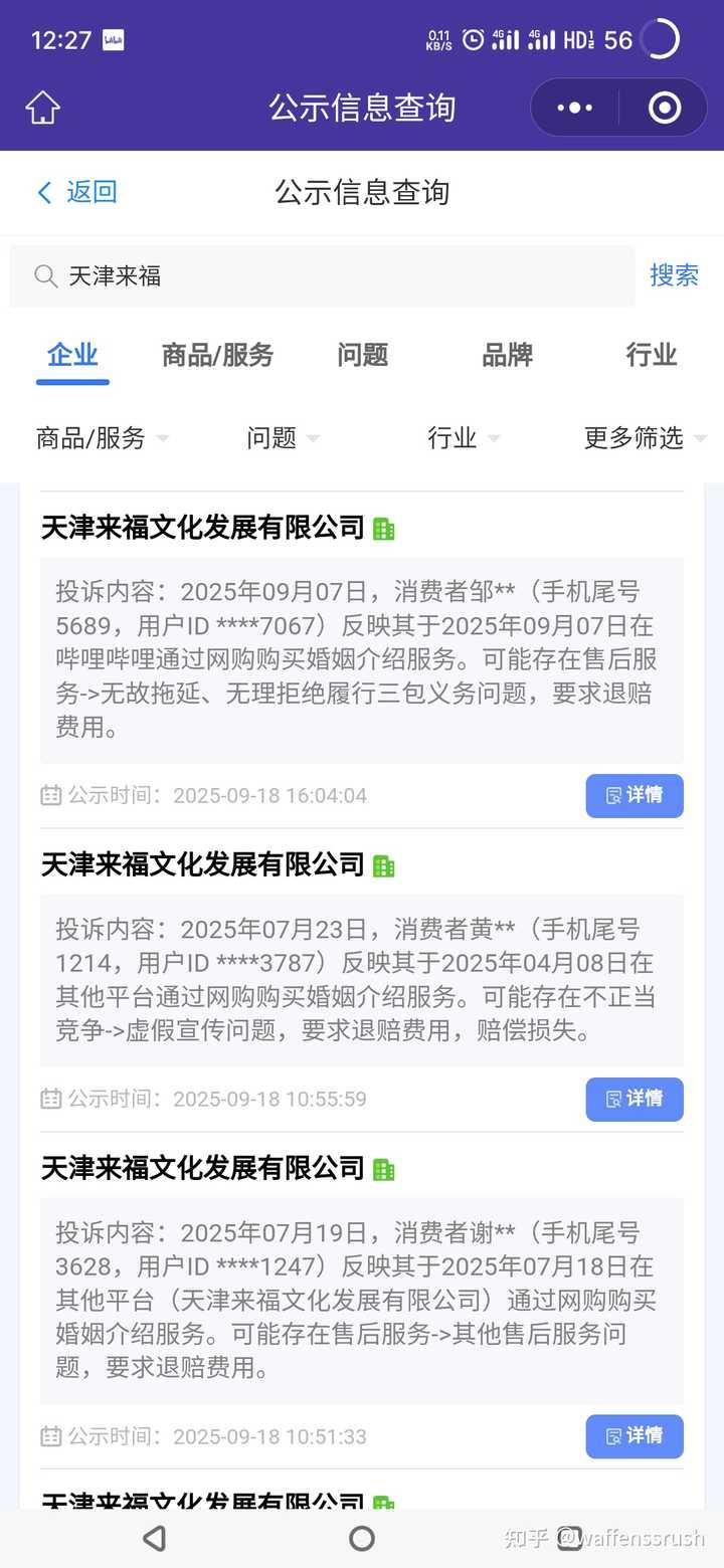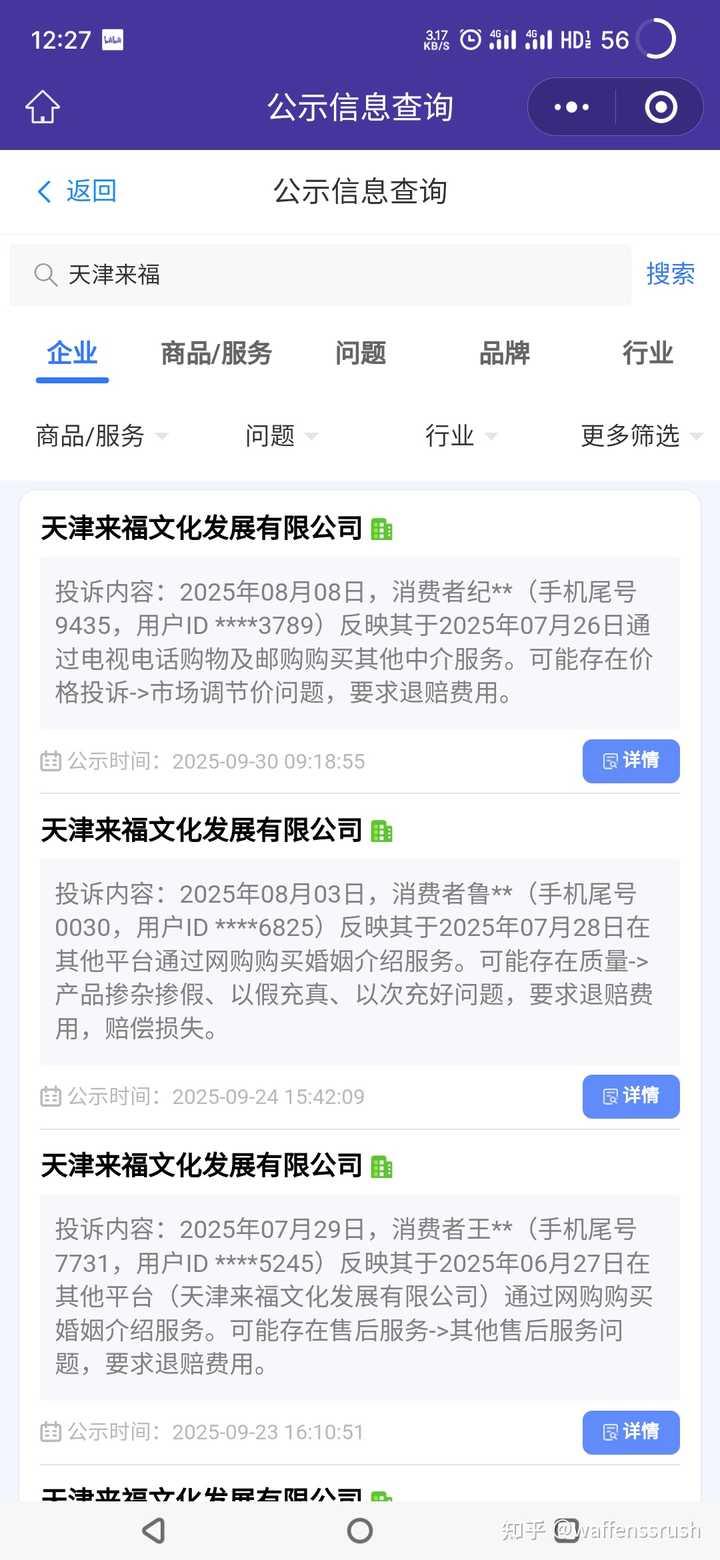 托别来!有用过牵手红娘服务的嘛?怎么样? 我教你,你去黑猫投诉和12315投诉公示搜一下就行了,就叫天津来福