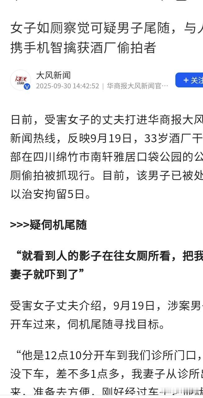 浙江绵竹,一女子去公厕方便,发现一名男子跟在她身后,疑似想要偷拍。女子灵机一动,立即到附近店里求助,偷拍惯犯竟被两名女子人赃俱获。 据极目新闻报道,张某是当地一家诊所的职工,在9月19日的时候,诊所附近的一条过道上突然来了一辆新能源款式的汽车。 本来张某也没有在意,只是在下午一点多的时候,张某因为内急,直接去了诊所附近的公厕,在路过那辆新能源车后,张某就看到何某准备下车。 只是张某很快想起了自己与何某在以前见过一次,那是在五月份的时候,当时何某在做偷拍他人的劣迹行为,只是那时他并没有被捉现行。 看到何某谨慎的跟随自己,张某有些不安,在来到厕所以后,张某并没有直接去上厕所,而是在厕所门旁边躲着,果然,在30秒后,张某就发现有人影往女厕所门前观望。 这让张某非常害怕,于是当即走出了厕所,只是她并没有注意到何某此时在干什么,她直接来到了一家公司的前台,这家公司离案发公司很近,而前台小姐姐也认识张某。 张某一见到这个小姐姐后,当即把自己的发现直接告诉了她,小姐姐听后非常生气,于是她也直接去往公厕。 果然,在小姐姐来到公测的最后一个蹲位的时候,没一会的功夫,她就听到有人直接来到了自己隔壁的蹲位。 在可疑人进去了以后,小姐姐直接打开了手机,一分钟后,她所在蹲位的隔板下就有一部手机伸进来录像。 小姐姐不动声色,在有了直接的证据以后,她便直接找到何某进行理论,最终双方互骂起来了。 在冲突升级后,越来越多的人围观过来了,见形势不妙,男子何某便夺路狂逃。 最终,在诊所的老板和附近的商户的追击下,何某最终被按住交给了民警,据他交代,他所偷拍的视频都已经删了。 那么从法律角度,如何看待何某的行为? 根据《民法典》第一千零三十二条、第一千零三十三条规定,自然人享有隐私权,任何组织或个人不得以刺探、侵扰、泄露、公开等方式侵害他人隐私权。 上厕所是个人的隐私,何某偷拍小姐姐上厕所,就是在公然侵犯他人隐私。 何某的这种行为会受到什么处罚? 根据《治安管理处罚法》第四十二条规定,偷窥、偷拍、窃听、散布他人隐私的,处五日以下拘留或者五百元以下罚款;情节较重的,处五日以上十日以下拘留,可以并处五百元以下罚款。 何某偷拍小姐姐的行为侵犯了她的隐私,虽然事后他把偷拍的视频删除了,但侵害已经产生,何某必将应该受到相应的行政处罚。 因为何某是多次实施偷拍行为,加上在事发后,他有逃逸的表现,违法情节较重。因此,何某极大可能会被处以五至十日的拘留,并处500元以下的罚款。 被何某偷拍的受害者,应该如何维护自己的合法权益? 《民法典》第一千零三十三条规定:当隐私权受到侵害后,被侵权人有权要求侵权人承担民事责任,包括停止侵害、赔礼道歉、消除影响,并可主张精神损害赔偿。 本案中,张某因为何某的偷拍已经有了害怕的精神表现。 如果何某存在传播或公开偷拍视频的情况,给受害者的名誉和精神状态造成了侵害,那么,受害者可以申请让何某停止或删除视频,并要求赔偿自己的精神损失。 目前,此案还在调查取证当中,对此,你怎么看?