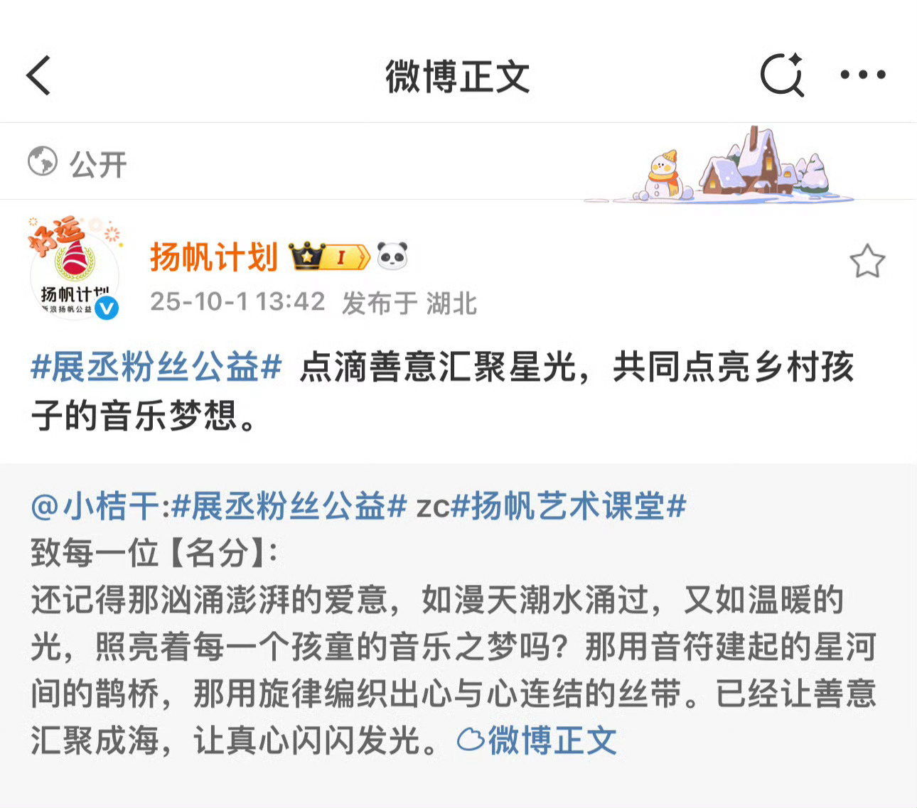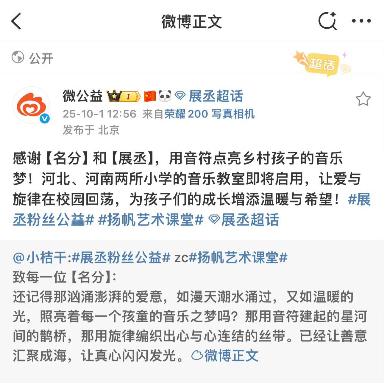 官方转发认证展丞粉丝做的儿童公益活动 目前已捐赠两间音乐教室[手指比心]