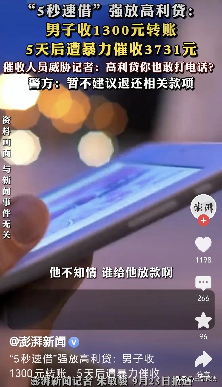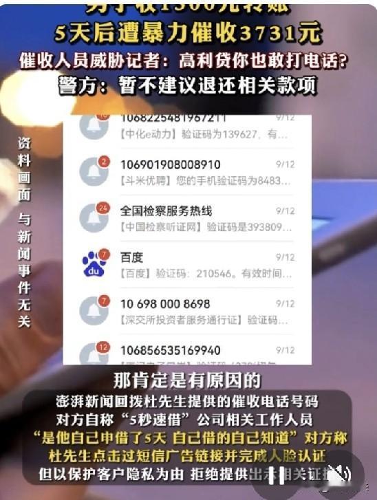 防不胜防!河南濮阳,一男子收到1300元,谁转给他的,他不知道,男子报警,谁知警方还没调查清楚,催收电话就接连打来,要男子还2430元,对方还说,这钱是男子在4天之前,从“某某速借”平台上借的,男子莫名其妙,我没借钱,立刻拒绝!谁知又过了1天,催收电话再度打来,又让他还3731元,对方威胁: 再不还钱,小心你全家! 杜先生从不借钱,他生活有度,什么借贷赖账,从来都和他无缘,可是不知道为何,他遇到一个意外。 9月7号这天,他打开手机一看,他的建行卡上收到1300元,杜先生立刻警觉,他没有问谁借过钱! 他又点开账单明细,这笔钱是一位姓杨的人转款过来。 可是,杨某名字陌生,并不是他的熟人同事,杜先生仔细筛查了一遍,并不认识这个名字叫杨某的人。 哪会有人平白无故给你打钱?是这人转错了账?按照现在的系统来说,要密码,要扫脸,转错的几率微乎其微。 杜先生一想,天上掉的都是陷阱,不要想着能白吃白占,杜先生立刻联系银行客服,他怀疑这会不会是诈骗资金? 客服也觉得蹊跷,既然来历不明,这钱当然就不能要,客服建议杜先生报警,杜先生立刻拨打了报警电话。 警方对此做了记录,立刻着手调查,杜先生放下心来,依旧照常上班下班。 谁知9月11号,一个陌生电话打来,杜先生本想不接,可是电话响个不停。 杜先生想一探究竟,害怕是哪位朋友会有急情,谁知电话刚拿起来,电话里传来一个恶 狠 狠的声音! 对方自称,是“某某速借”平台的工作人员,杜先生4天前在他们平台上借了1300元,今天是还款日期,连本带息是2430元! 杜先生大吃一惊,我啥时候问你们借过钱? 对方态度非常恶劣: 你敢说你没借?我可告诉你,你今天还钱是2430元,要是拖到明天,那你要还的就不是这个数了! 杜先生大惊,难道他说的就是那个1300元? 按照他们的逻辑,1300只用了4天,就成了2430元,这样的利息岂不是高利贷? 杜先生怒斥对方,要他们不要信口胡来,他是收到了1300元,可是,那并不是他主动借钱。 这1300元为何会打到他建行账户,他并不知道,并且已经报警,正在等待警方的调查! 谁知对方嚣张,还要和杜先生加上联系方式,杜先生拒绝,感觉对方就是骗子。 谁知又过了一天,那个电话还是接连打来,杜先生烦不胜烦,接通后问他们到底还要咋办? 对方冷笑,我已经说过,昨天不还,今天就不是昨天那个数了,你现在要还3731元! 杜先生懵了,一天时间,又多了1300多元,这是明抢,他坚决拒绝! 对方看他态度坚决,立刻打出最后的底牌: 你敢不还,你休想安稳,包括你的亲朋好友,你们统统都别想安生! 杜先生有些担心了,他自己倒不介意,他怕影响到家人朋友。 可是他思前想后,自己并没有在任何平台上借钱,这是飞来横祸,对方怎么能知道自己的账号? 他就百思不得其解,自己明明没有借钱,遵纪守法,他们要去打扰家人,还要打扰亲朋好友,这些人受到连累,自己岂不是成了罪人? 杜先生找到记者,反映了情况,记者赶忙拨通了催收人的电话。 可是对方还是那一句话,坚持说是杜先生自愿在他们借贷平台上借了1300元。 他们还说,我们凭什么要借钱给他,那肯定是有原因的!他不知情,谁给他放贷? 是他点开了短信广告链接,是他自己刷脸认证,申请了5天借款,谁借钱谁知道! 可杜先生自己也记不清了,他是不是点开过什么非法链接,可是他确信,自己坚决不会借钱! 记者要求对方,你说这话,得拿出证据,可对方拒绝,说要保护客户隐私。 同时,对方还对记者威胁: 高利贷你也敢打电话?你真的是为了新闻什么都不怕啊? 记者秉承真相,压根就不怕他,对方看吓唬不住,立刻就说: 敢不还钱,我们有的是专业催收人员! 记者在网上查询了一下,根本找不到催款人说的某某速借平台,既没有任何公司信息,也没有进行过工商注册。 就连催收电话,也不是那种正规公司的号码,应用软件里也找不到这个“某某速借” 如今,这笔钱仍然停在杜先生的账户,按照他们的计息方式,已经越滚越多。 目前,警方正在调查,暂不建议杜先生退还该笔款项。 《最高院关于审理民间借贷案件适用法律若干问题的规定》: 年利率超过LPR四倍的借贷不受法律保护,杜先生所涉借贷利率远超该标准。 此类强制放款形成的借款合同本身无效,高额利息也不受法律保护。 《刑法》第193条规定: 催收高利放贷等产生的非法债务,情节严重的,处3年以下有期徒刑、拘役或者管制,并处或者单处罚金。 具体情形包括使用bao力、胁迫方法的,限制他人人身自由或者侵入他人住宅的,恐下、跟踪、s扰他人的。 催收方通过频繁电话轰zha、威胁s扰杜先生及其亲友等方式催收高额利息,其行为符合催收非法债务罪的构成要件。 一旦警方揪出这些放高利贷者,等待他们的将是严厉的处罚! 关注@王哥说法 多学法律少吃亏!
