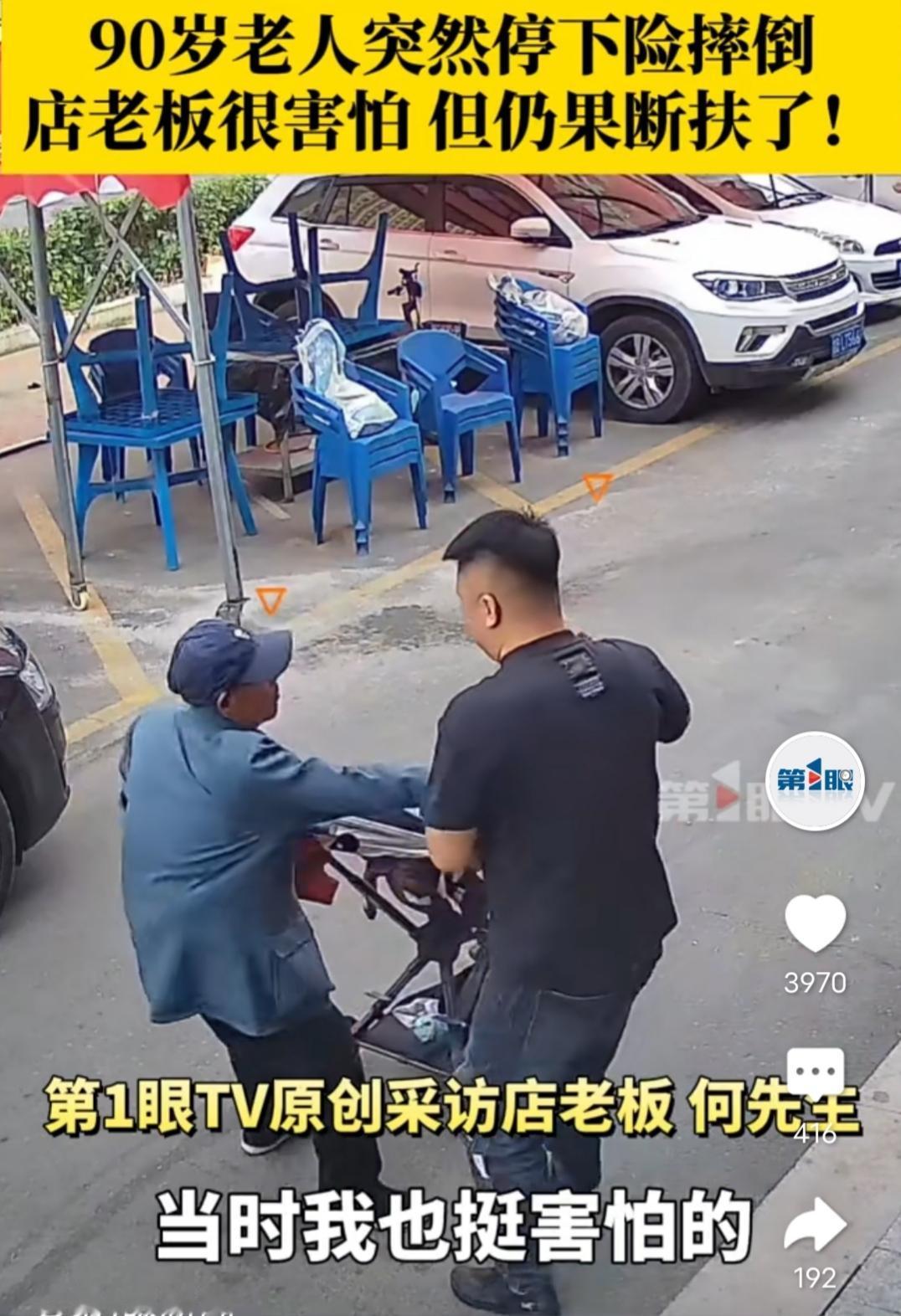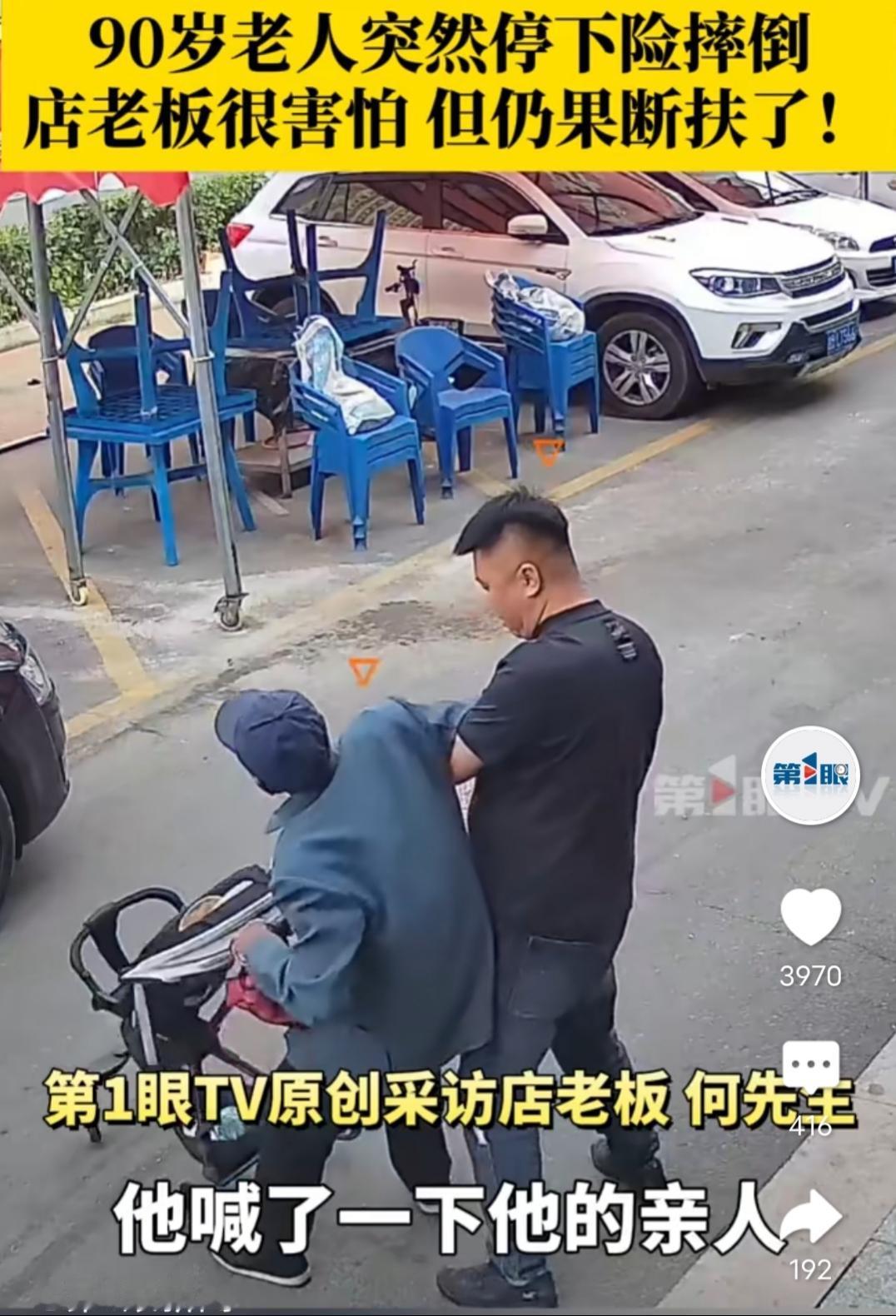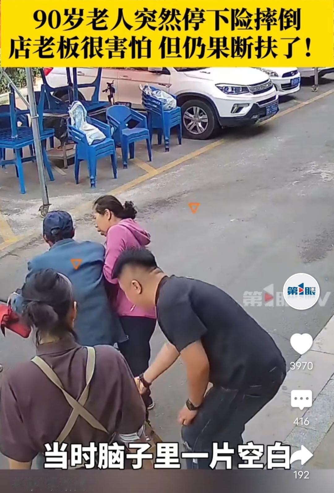 90岁老人突然停下险摔倒,店老板很害怕,但还是果断扶了。 相关平台看到的消息,