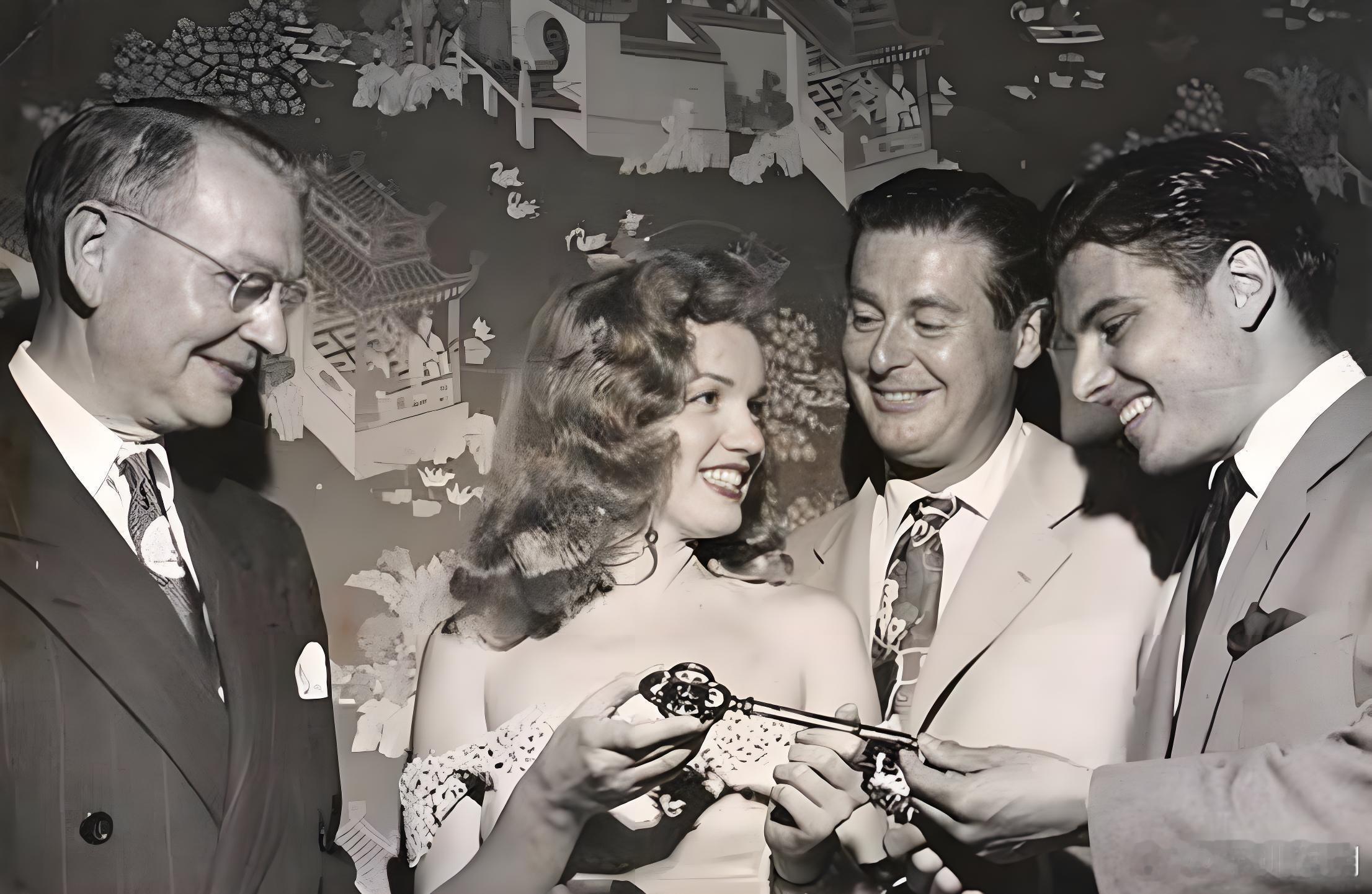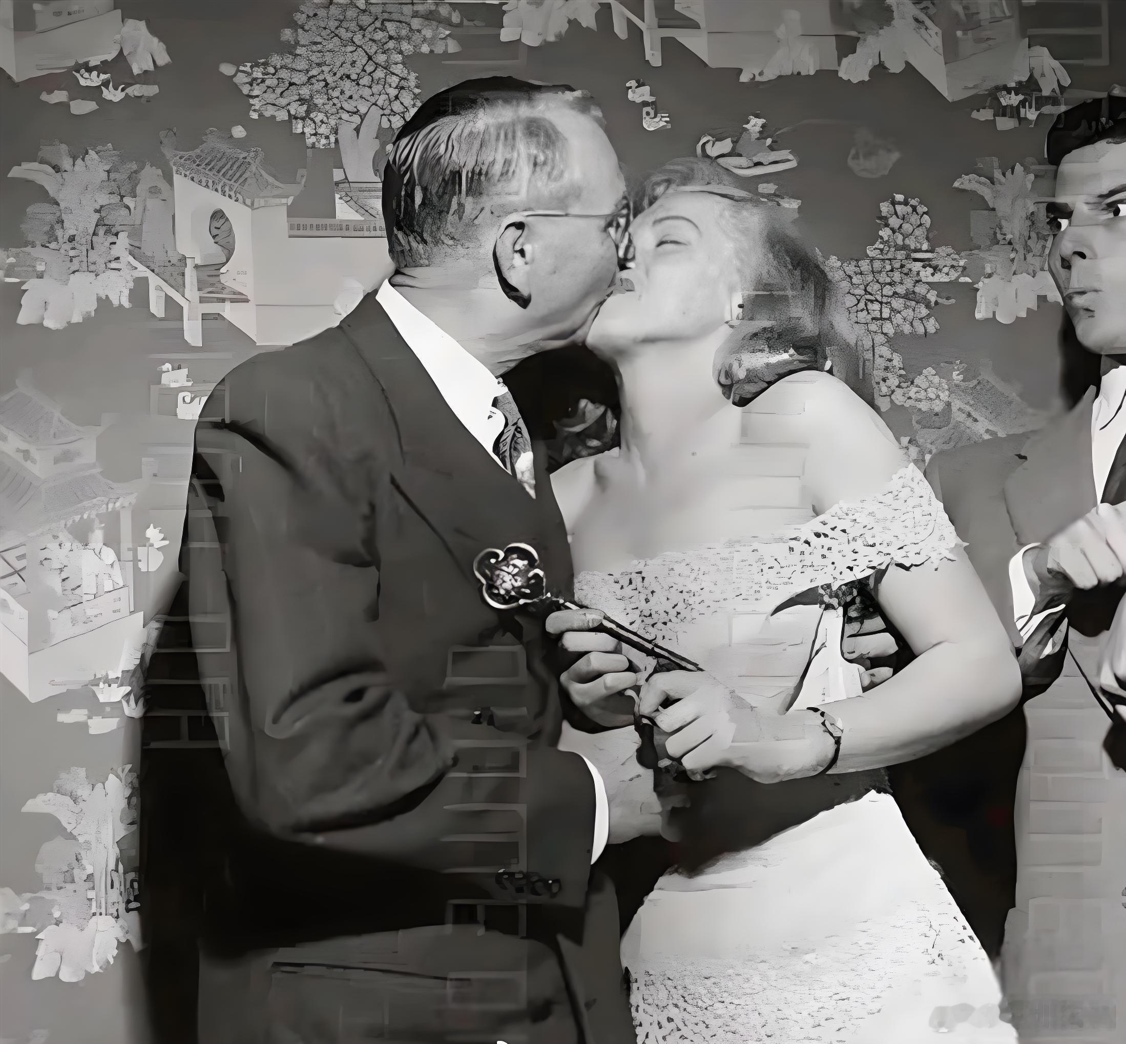 1949年6月21日,美国。23岁的梦露在沃伦斯堡“殖民地武器”(RiteAid)酒店度过一夜。当地的城市主管李奥顿,向她展示这座城市的大铜钥匙。梦露兴奋的嘴对嘴亲吻了李奥顿,老李则用手紧紧搂着梦露的腰,享受着怀里这位后来被世人称为“性感女神”的女人。