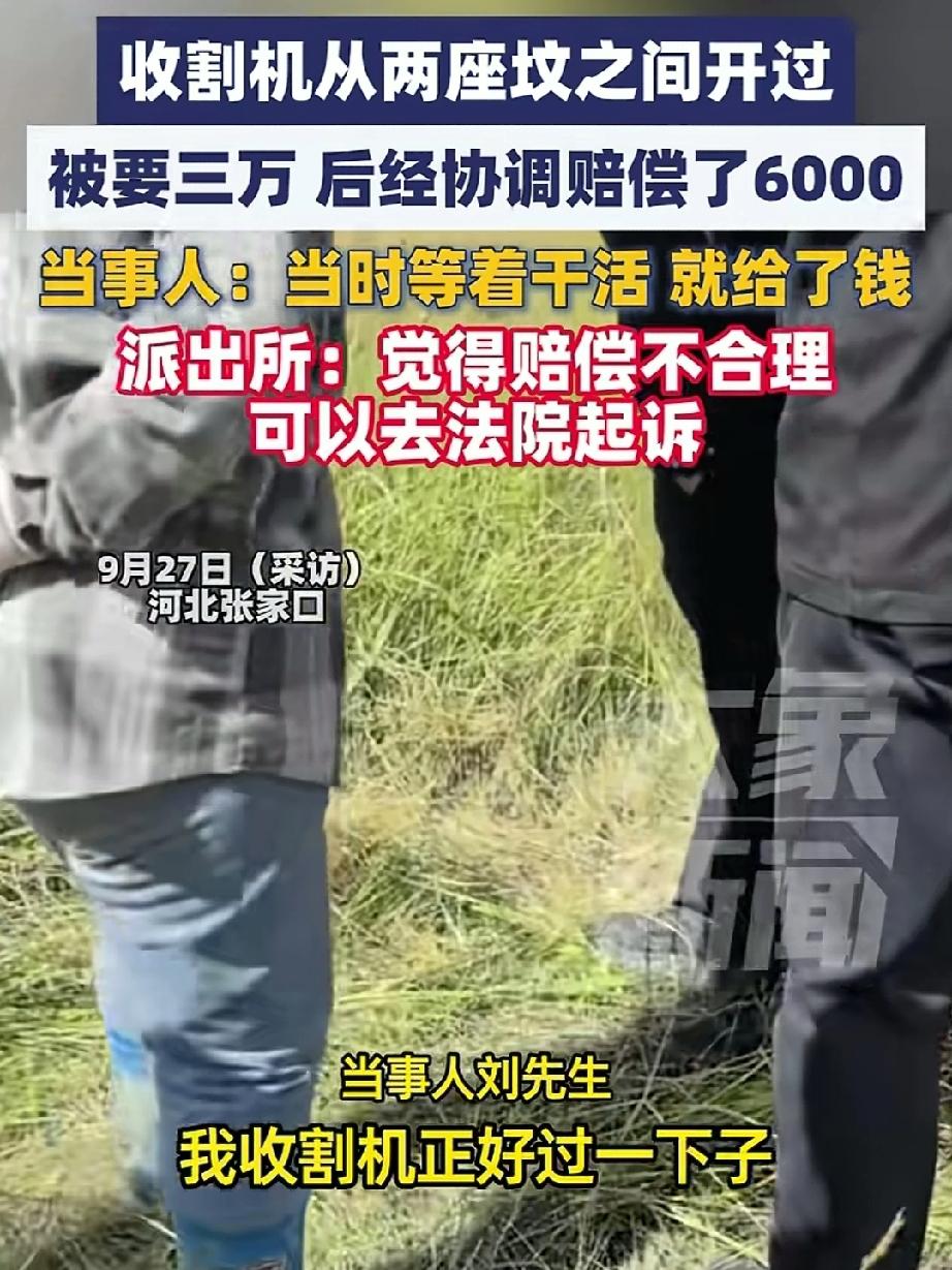 当下正是秋忙之季刘先生开收割机去地收玉米,收割机从两坟之间开过,被要30000,