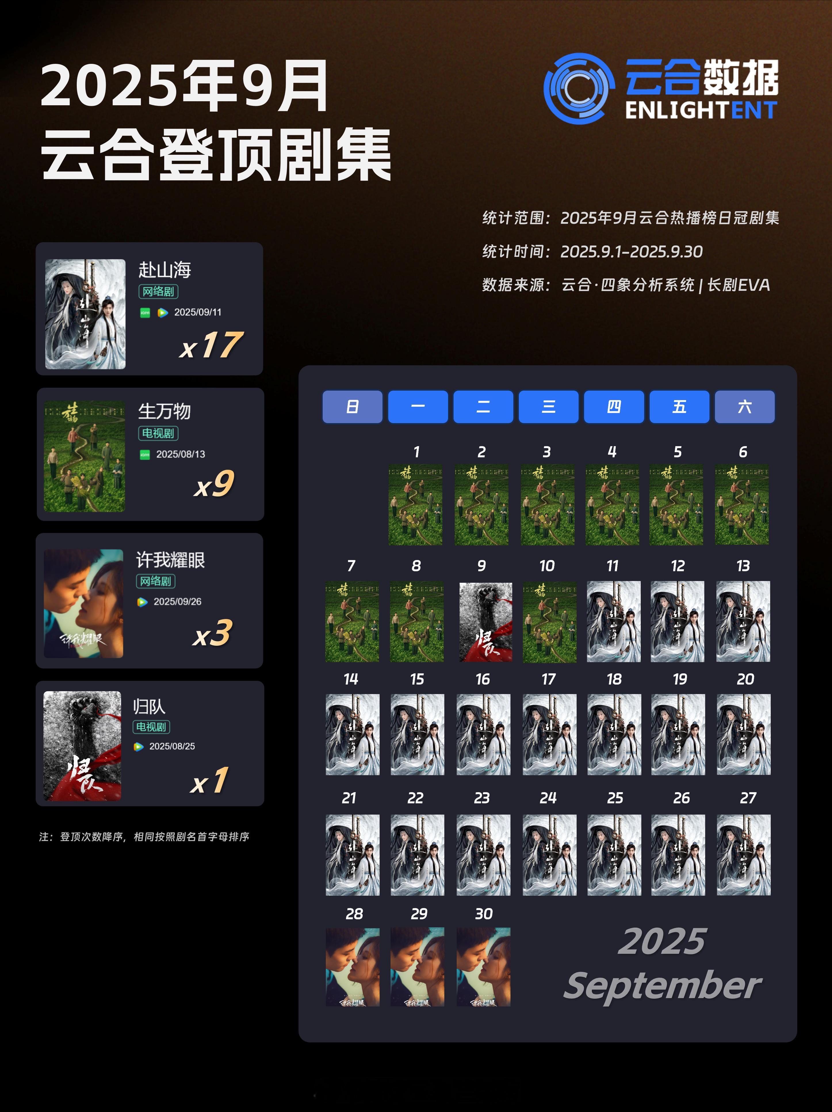 2025年9月云合登顶剧集四部17天赴山海9天生万物+8月17天3天
