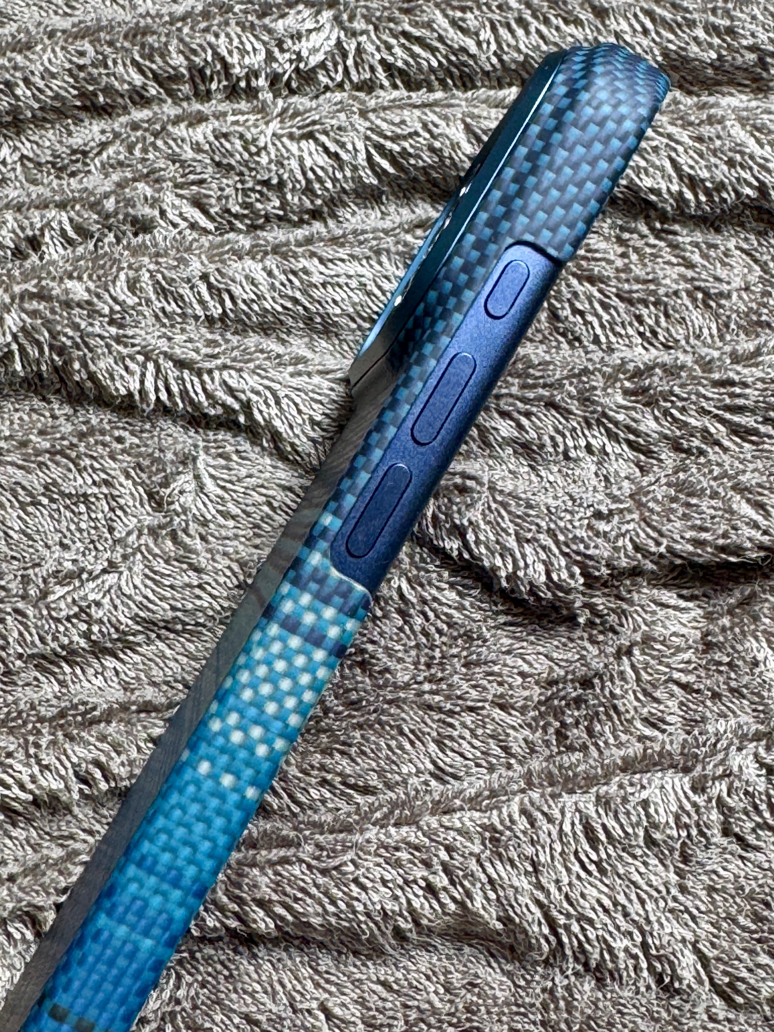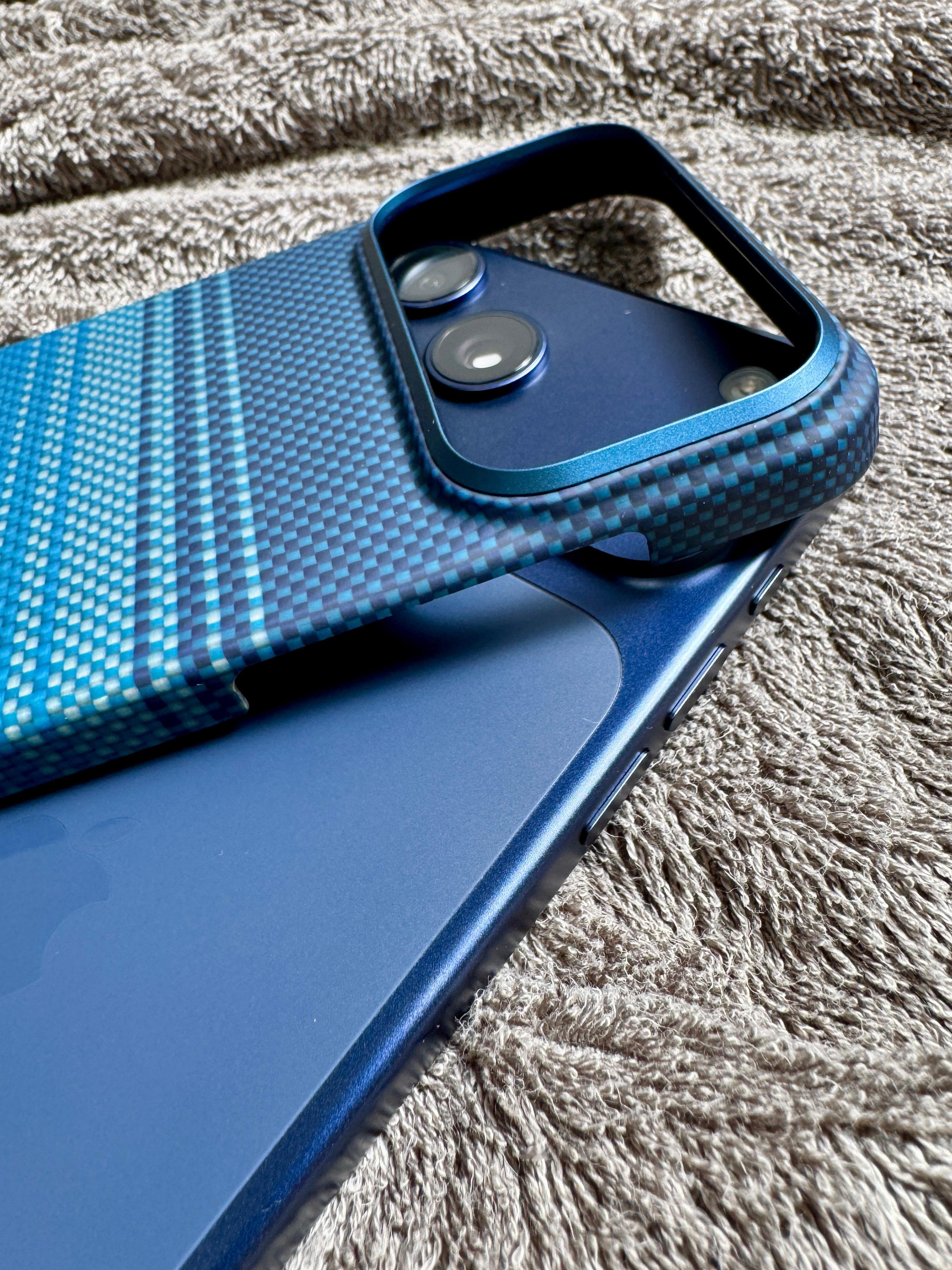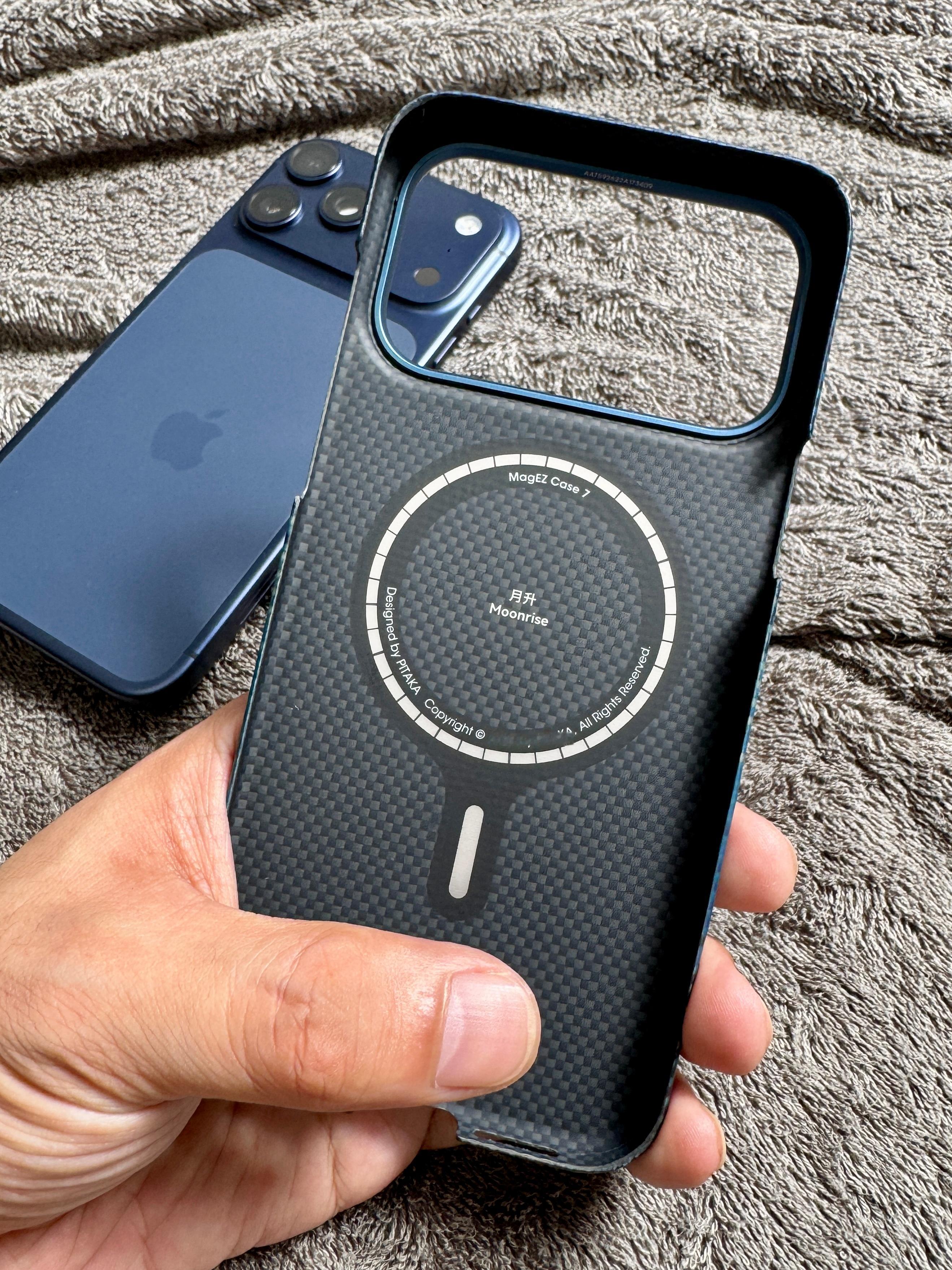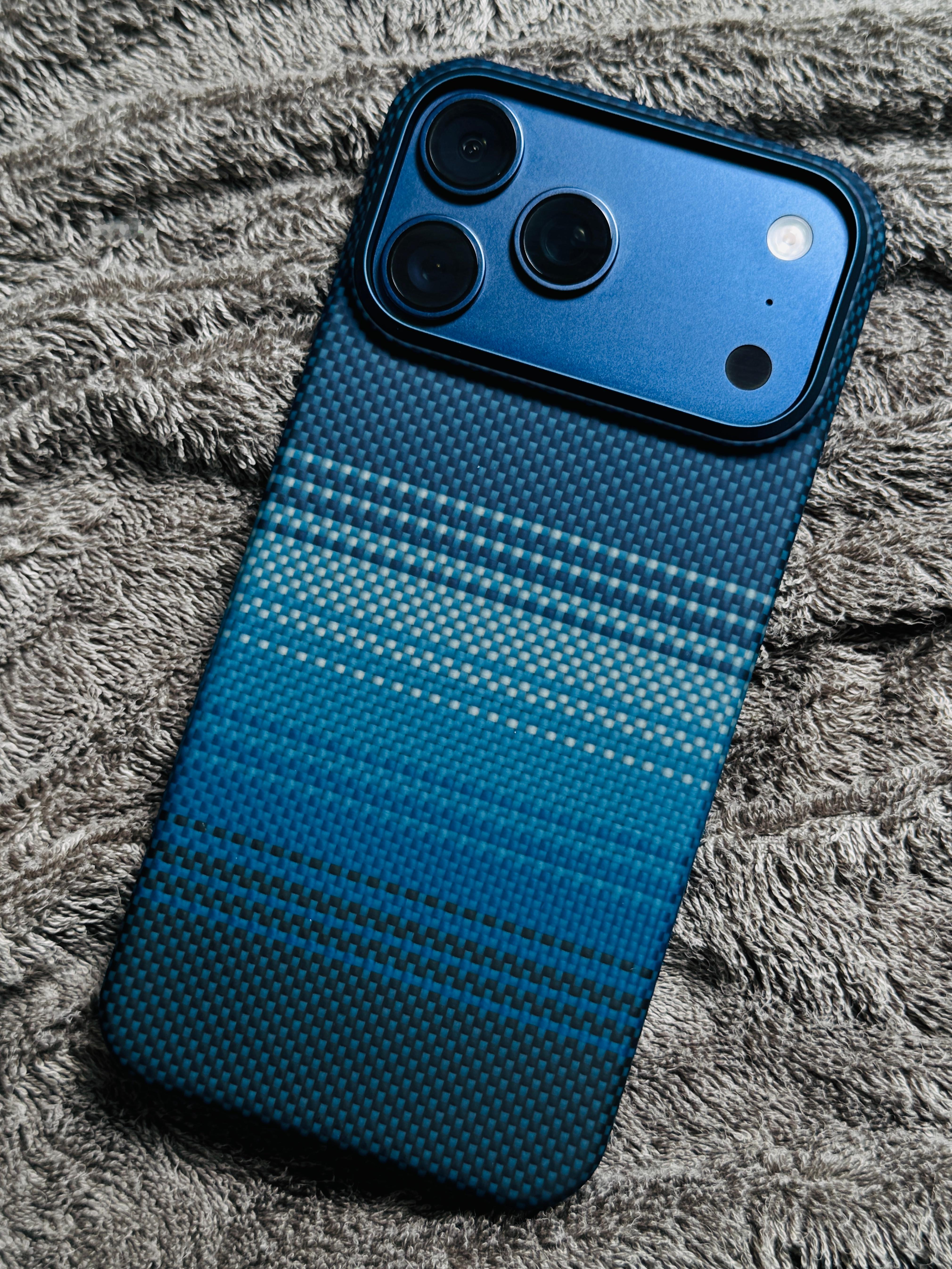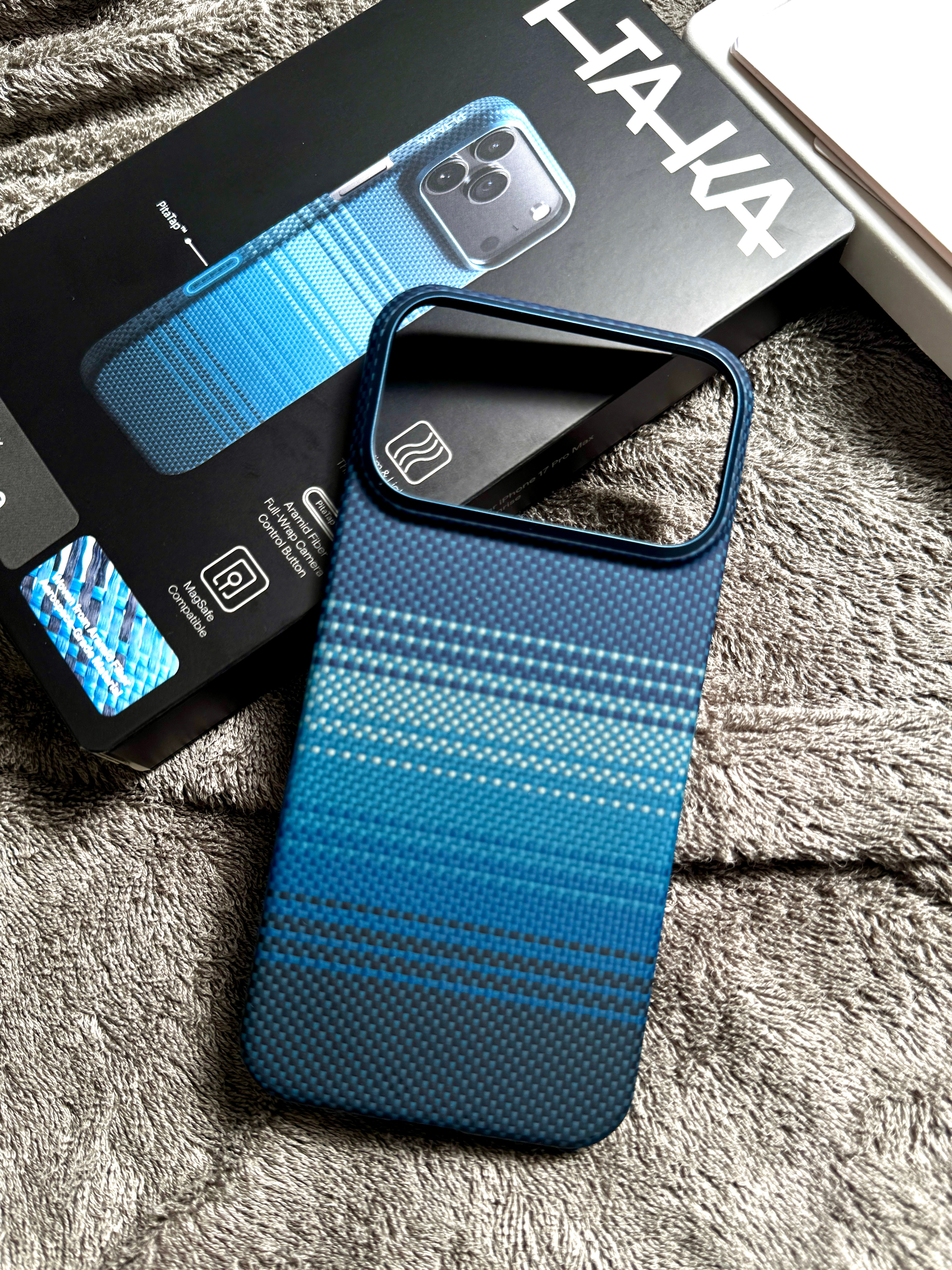 又给我的iPhone 17 Pro Max安排了PITAKA的手机壳,这次选择日落月升系列,这款凯夫拉壳同样是超薄的设计,几乎裸机的手感,就算这次Pro Max已经6.9英寸也不担心太宽不好掌握。