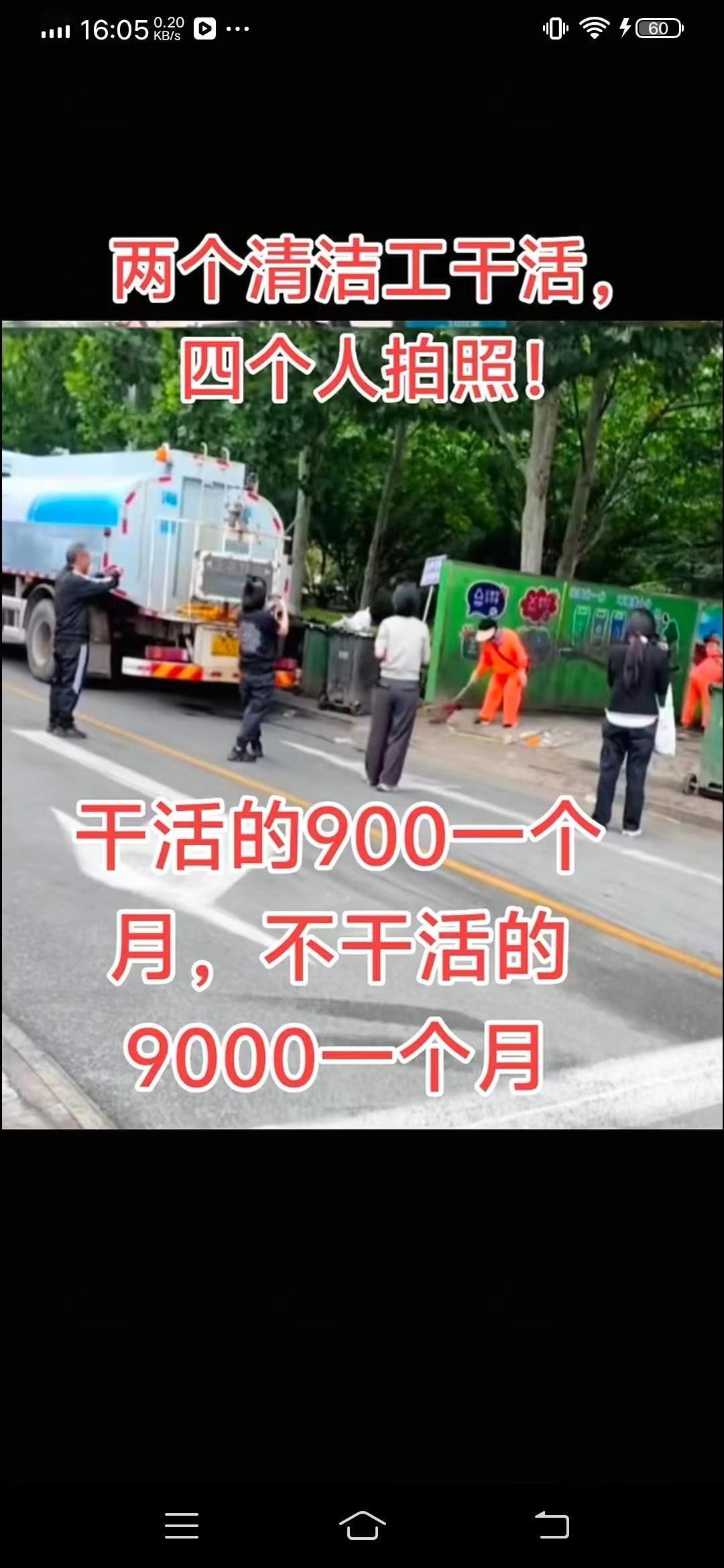两人干活四人吃闲饭 4个头头检查两个扫地工人干活,这不是大才小用还浪废人才吗?要是三个人卷卷袖子来干活,那不就能干出很多活了吗?留一个人去检查不行吗?四个人都去干活不是更好吗?那还用得着检查吗? 这些人是脑壳笨,还是太聪明了?。