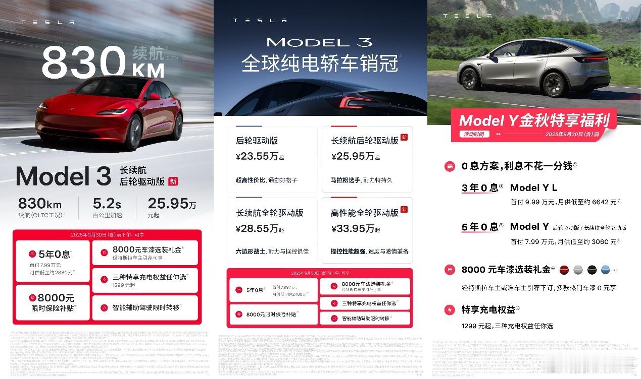 车展期间,特斯拉同步推出重磅购车政策:10月31日前下单Model Y及Model 3长续航后驱版,即可享受“5年0息”、8000元保险补贴、8000元车漆选装礼金、1299元特享充电权益,外加“智能辅助驾驶限时免费转移”等多重福利,打造年内超值购车时机。