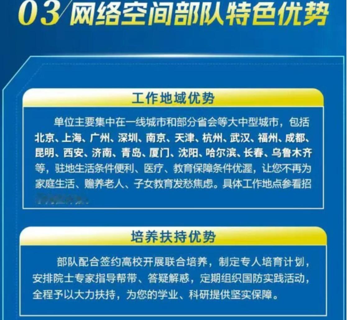 网络空间部队直招军官及定向选拔的海报引热议! “9.3”阅兵后,部队相继发布了直招军官及定向选拔的海报,为2025年直招军官及定向选拔做宣传!其中,网络空间部队最引人注目,不仅是网络空间部队的工作地点好,主要集中在一线城市和部分省会等大中型城市,而且要求也很高,目标院校仅限于全国9所。 这9所院校应该是网络空间部队眼中最强的院校之一,至少他们的毕业生已得到了部队的认可。这9所目标院校中的7所为“985工程”大学,2所为“211工程”大学。分别是清华大学、北京大学、上海交通大学、中国科学技术大学、哈尔滨工业大学、武汉大学、华中科技大学、北京邮电大学和西安电子科技大学。 俗话说内行看门道,外行看热闹,这份海报除了这9所院校的“硬广告”外,还告诉大学们一些行为规范。毕业时想要参加直招军官或考公的,大学期间不可触碰的5条“红线”是: 1、不要留级; 2、不轻易休学,特别是时间超6个月以上的休学; 3、不要被处分,特别是警告以上的; 4、不在学术或科研上出现不端行为; 5、不要选报定向就业专业(定向后,不可参加考公、考警,也不能参加军队直招军官)。