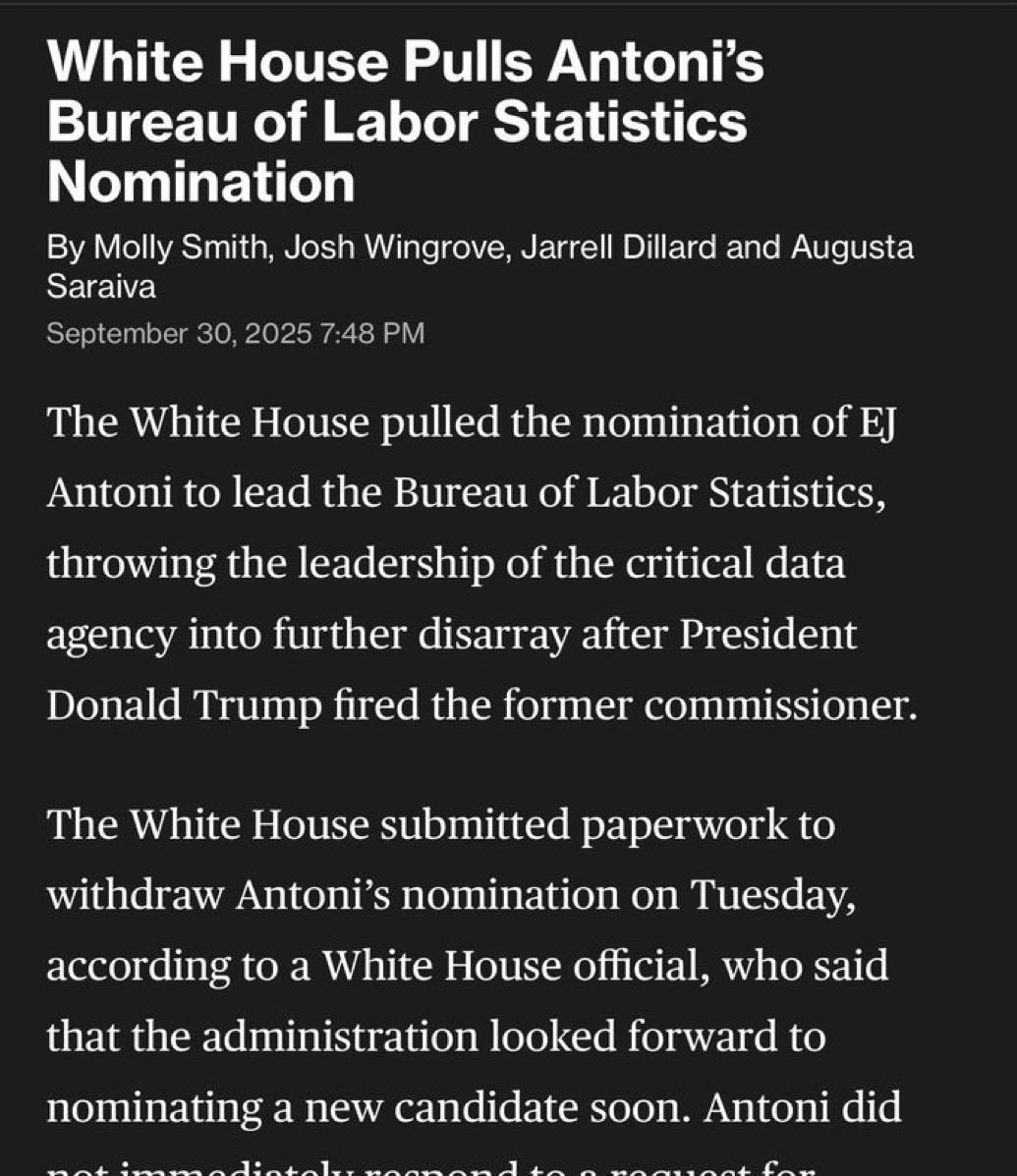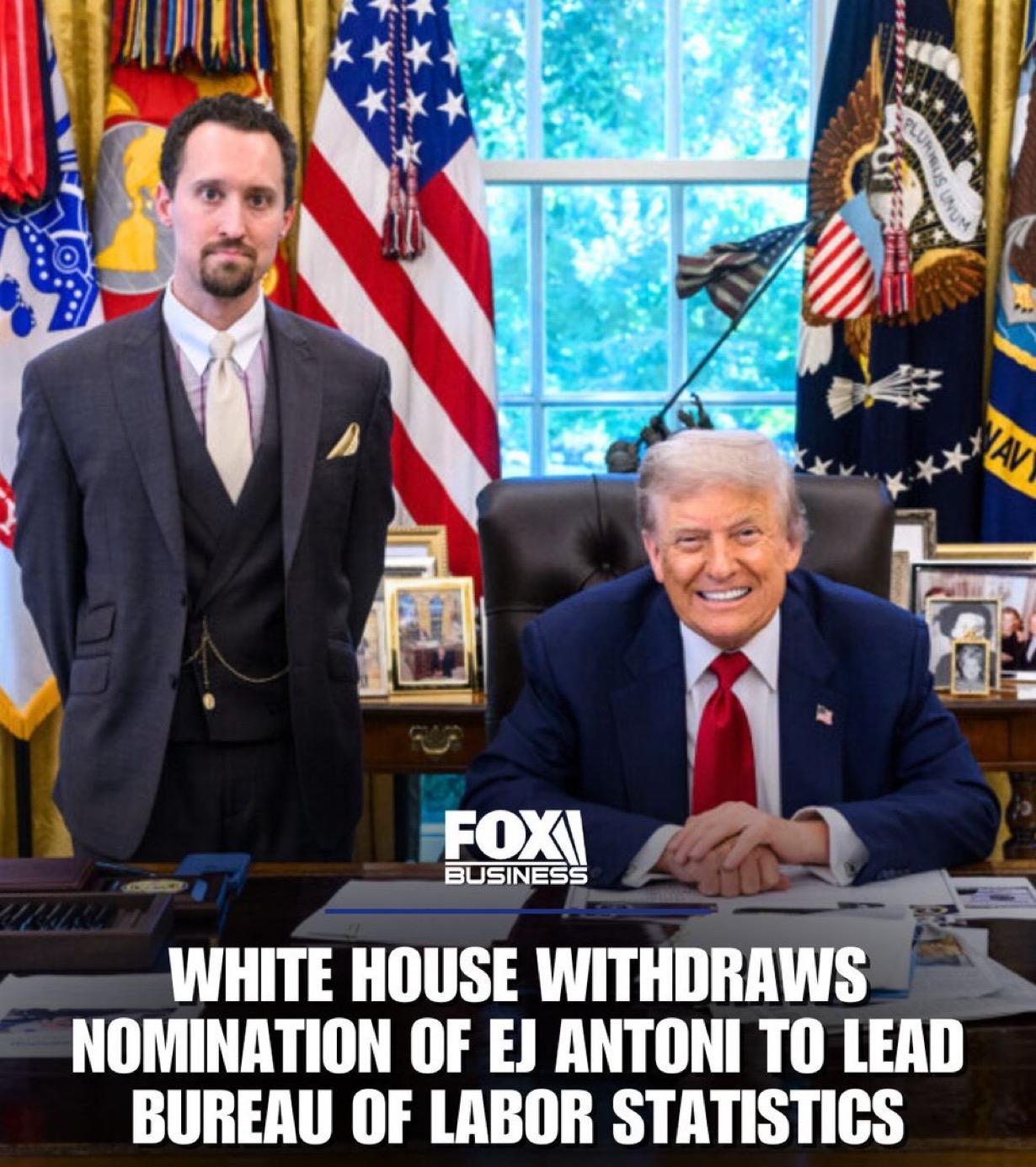 特朗普总统撤回了对安东尼EJ Antoni 担任劳工统计局局长的提名。