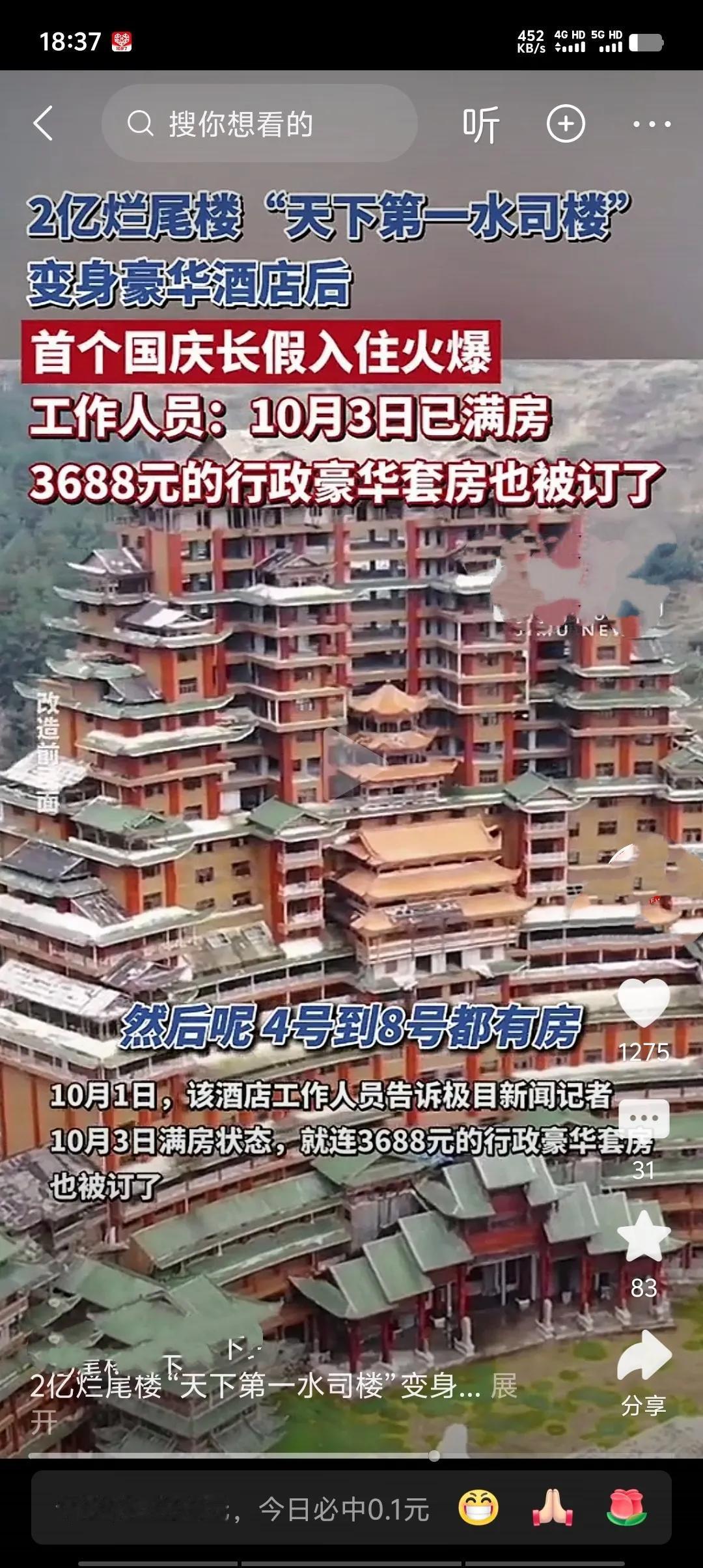 贵州独山县曾举债2亿打造的“天下第一水司楼”烂尾多年后,经格美集团改造为紫林山豪利维拉酒店,于今年国庆开业。其3688元行政套房国庆期间被订满,酒店凭借独特文化标签和生态主题,首秀即迎火爆预订。贵州酒店