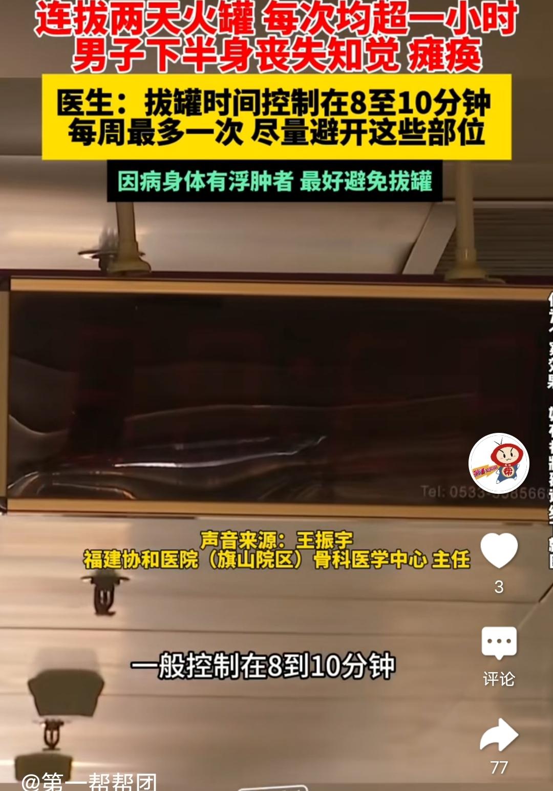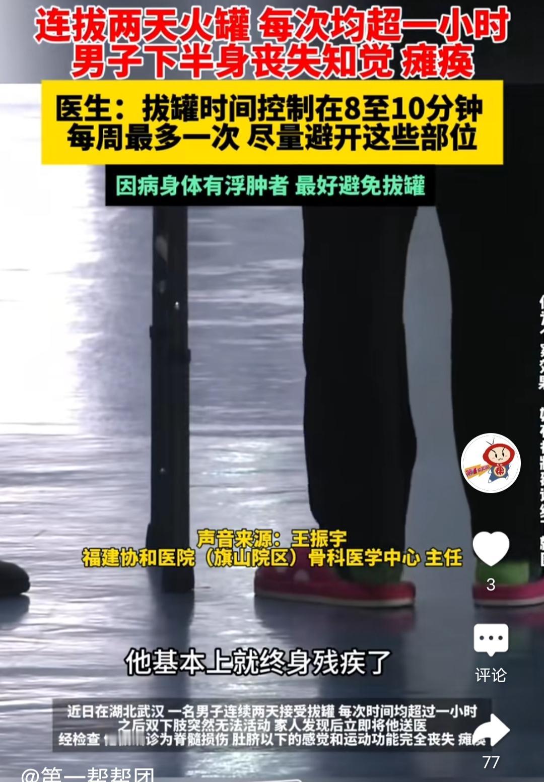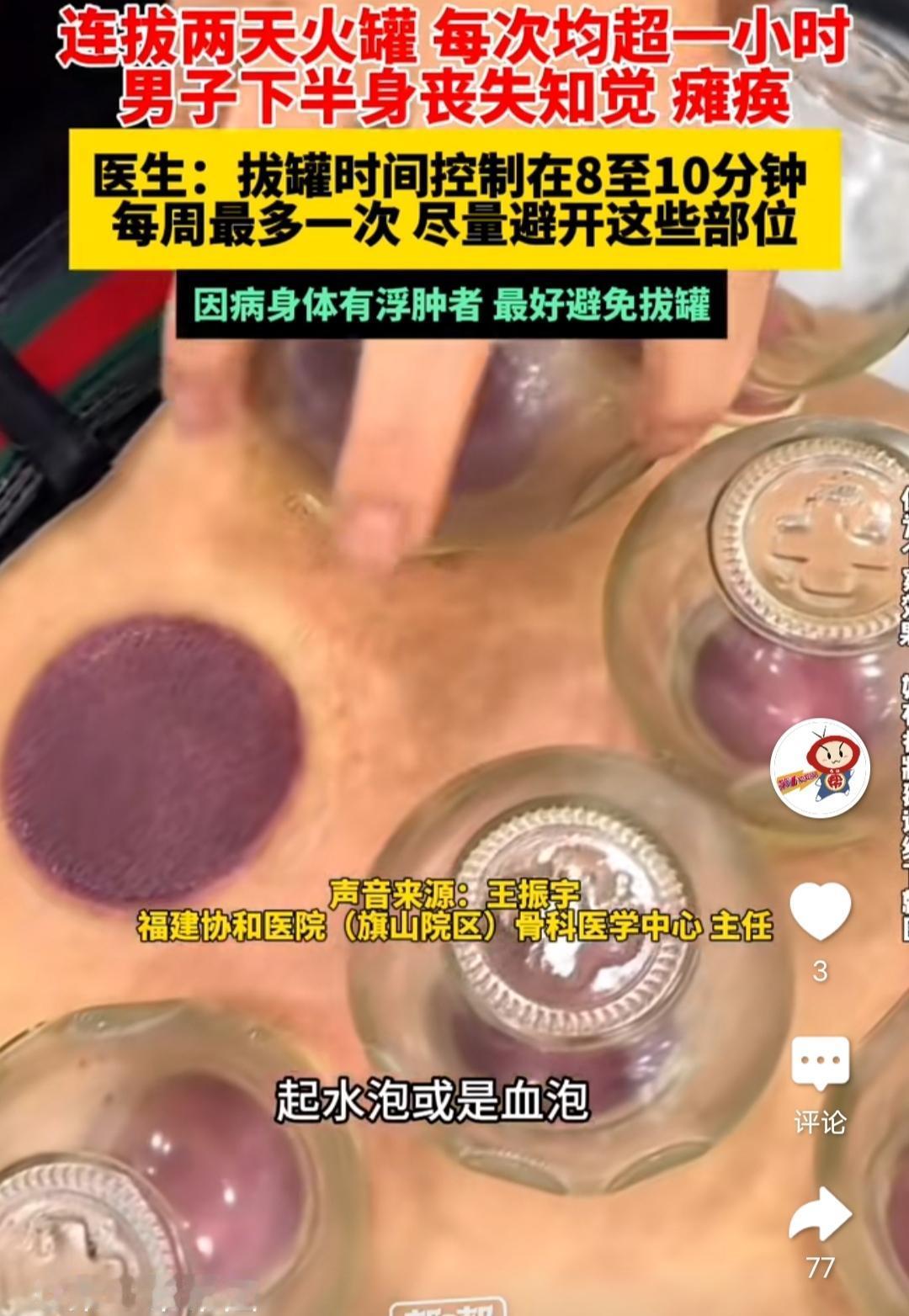 连拔两天火罐,每次均超一小时,男子下半身丧失知觉。 相关媒体的报道,湖北武汉的一名男子,连续两天腰背部拔罐,每次均超过一个个小时。结果导致下半身丧失知觉,医生建议拔罐时间控制在8-10分钟,每周最多一次,如果身体有浮肿的,最好不要拔罐。 其实我个人并不喜欢拔罐这个东西,可能很多人喜欢做这个,但是我就是不喜欢,每每看到有人背上那些一块一块乌红乌红的拔罐印子,我就打心里看着不舒服,没有原因,就是看着不舒服。所以我从来不会搞什么拔罐什么的。 喜欢的人可能说那是因为你没有拔过,没有感受过那拔后的舒服感,所以不喜欢,有的人可能还会批评我,但是人各有志拔,毕竟可能真的有好处的地方,但是该注意还是得注意吧,毕竟每个人的生命是各人自己负责,每个人按照自己喜欢的样子好好生活吧,愿好人干净的人都健健康康。