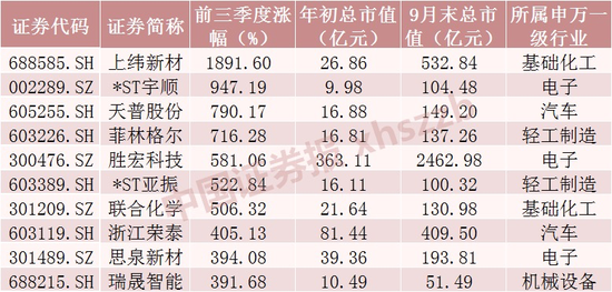 前三季度A股十大牛股分别为上纬新材、*ST宇顺、天普股份、菲林格尔、胜宏科技、*ST亚振、联合化学、浙江荣泰、思泉新材、瑞晟智能,其中涨幅最大的上纬新材累计上涨1891.60%,*ST宇顺涨逾940%,天普股份、菲林格尔均涨逾700%。