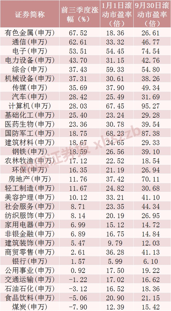 行业方面,有色金属、通信、电子行业领涨。个股方面,剔除前三季度上市新股后,超4300只股票上涨,最牛股票上纬新材累计涨近1900%。