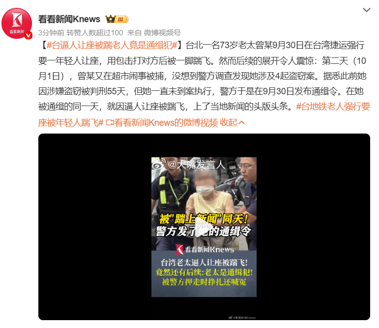 台逼人让座被踹老人竟是通缉犯 73岁曾姓妇人前(29)天搭台北捷运淡水信义线想坐优先席,先持手提袋攻击位置上的年轻人,遭对方反击,甚至「被踹飞到对面座椅」,该画面被民众录下发布在社群引发热议。不料经调查,曾妇竟因窃盗案遭判55天拘役未到案执行遭通缉,北市大同警方锁定她常出没地,今天在她住家附近超商盘查,顺利逮捕归案。 。台地铁老人强行要座被年轻人踹飞