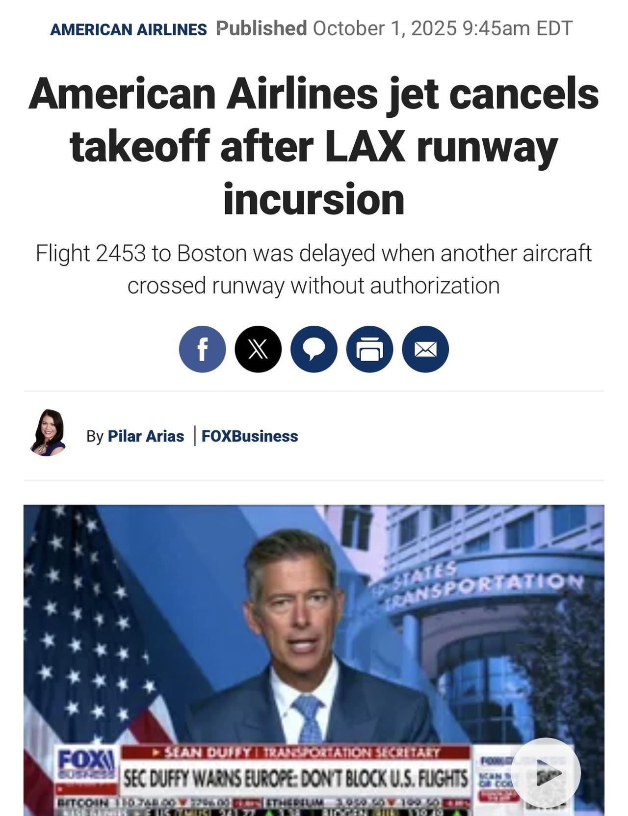 当“机组人员发现跑道上还有另一架飞机”时,一架计划飞往马萨诸塞州的美国航空公司的客机及时中止从洛杉矶国际机场起飞,避免了一场灾难。 美国航空公司2453航班在周二晚上10点35分左右试图离开洛杉矶国际机场(LAX)前往波士顿,当时“机组人员在跑道上观察到另一架飞机”,该航空公司向福克斯商业证实。 该航班由空客321运营。美国航空公司说,机上有94名顾客和7名机组人员,晚上晚些时候再次出发。 联邦航空管理局(FAA)表示,当AeroLogic 619航班“未经授权越过洛杉矶国际机场的跑道”时,就发生了潜在的危险情况。