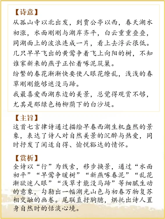 全诗以“行”为线索,移步换景,通过“水面初平”“早莺争暖树”“新燕啄春泥”“乱花渐欲迷人眼”“浅草才能没马蹄”等细腻生动的意象,勾勒出一幅湖光山色与初春万物复苏相交融的画卷。尾联直抒胸臆,烘托出诗人置身自然时的恬淡心境。