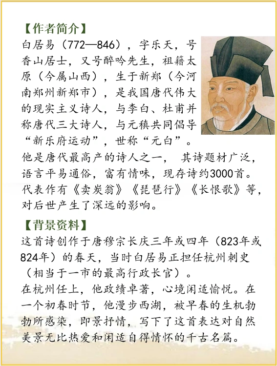 这首诗创作于唐穆宗长庆三年或四年(823或824)的春天,当时白居易正担任杭州刺史(相当于一市的最高行政长官)。在一个初春时节,他漫步西湖,被早春的生机勃勃所感染,即景抒情,写下了这首表达对自然美景无比热爱和闲适自得情怀的千古名篇。