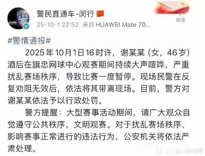 上海网球大师赛一女球迷被抬出场,警方通报:谢某某(女,46岁)酒后严重扰乱赛场秩序,被行政处罚。