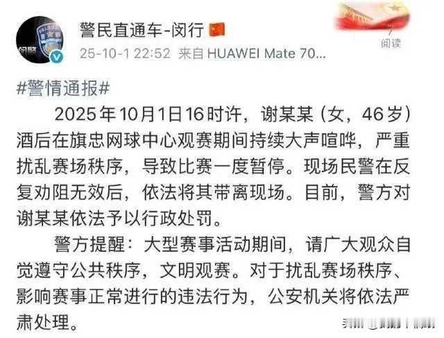 这回旗忠网球中心的赛场,没等来“ACE球”,倒迎来一位“酒驾式观赛”的狠人!46岁的谢女士两杯酒下肚,直接把赛场当KTV包间——别人看球她开个唱,比赛愣是被她“喊停”了!民警劝阻?不存在的,酒劲上头的人眼里,自己才是全场唯一“主角”! 要我说,这种“发球全靠吼”的观众,就该直接红牌罚下!建议各大赛事组委会连夜更新购票协议:酒后闹事者,终身禁止踏入场馆半步,附赠“法治大礼包”体验卡一张。毕竟体育精神追求的是“更高更快更强”,可不是“更吵更疯更荒唐”啊!