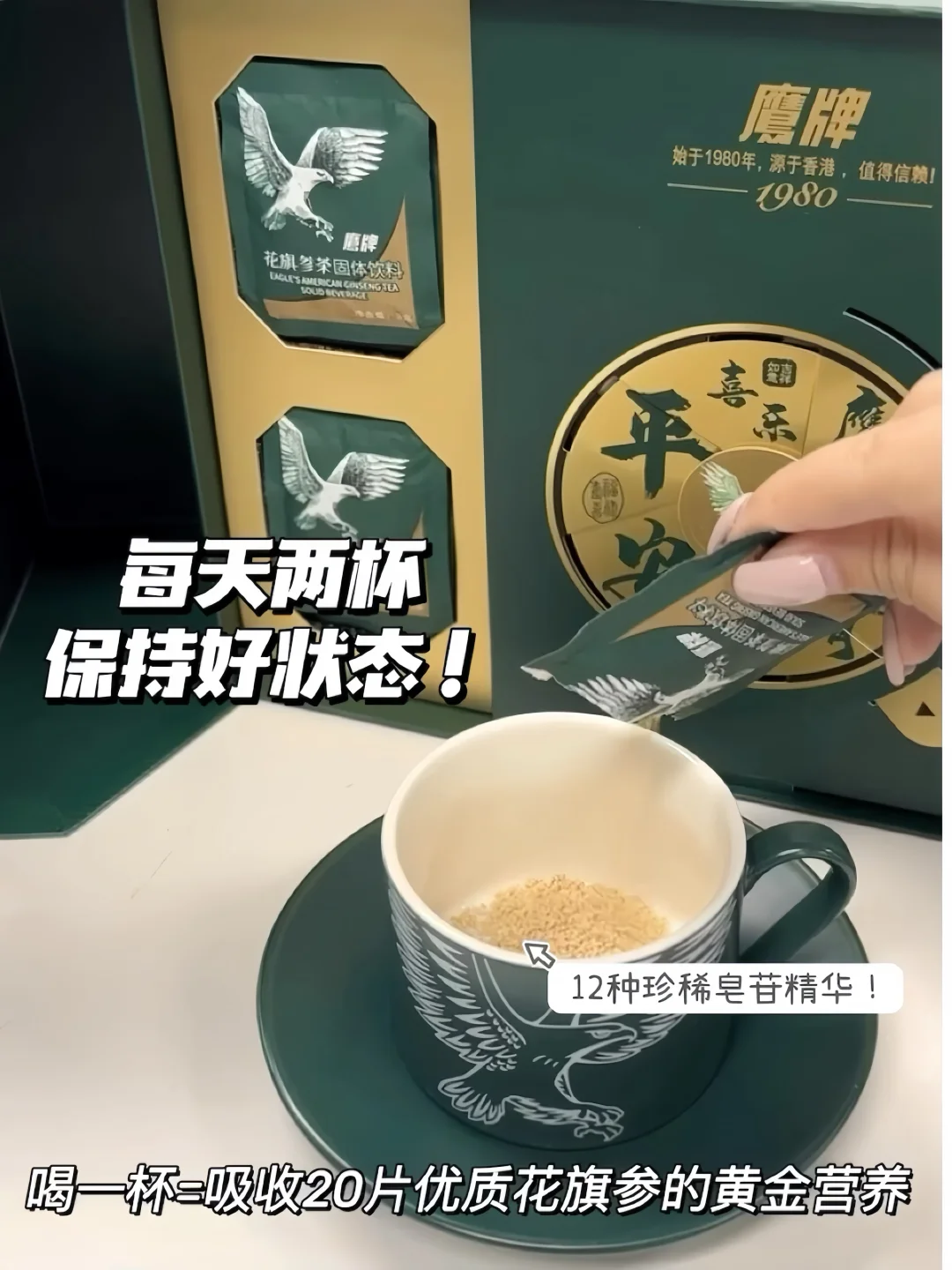 🏮口碑与实力并存,鹰牌甄选20片优质花旗参的精华部分,把12种“参中黄金”皂苷精华浓缩进这一小包参茶颗粒里,每天两杯温和滋补,保持能量满满好状态,自免力悄悄提高,换季也不用再担心!