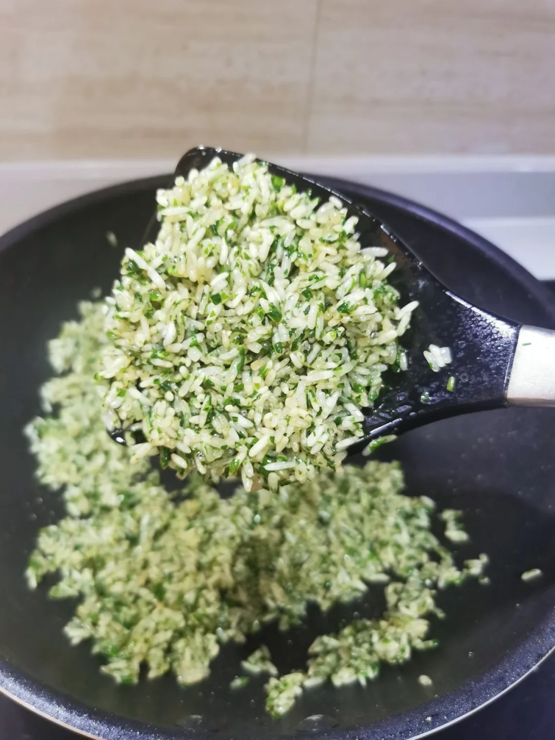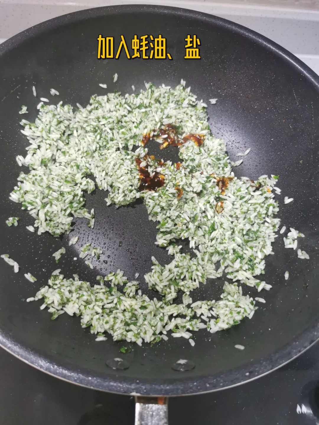2⃣️、把锅烧热,加入猪油,猪油多加一点点,加入剁碎的蛤蒌叶炒出香味,然后把大米放入锅里快速翻炒均匀,然后加入一勺蚝油、少许盐继续翻炒均匀。炒到大米的水份干了,就可以把米装入电饭锅里。