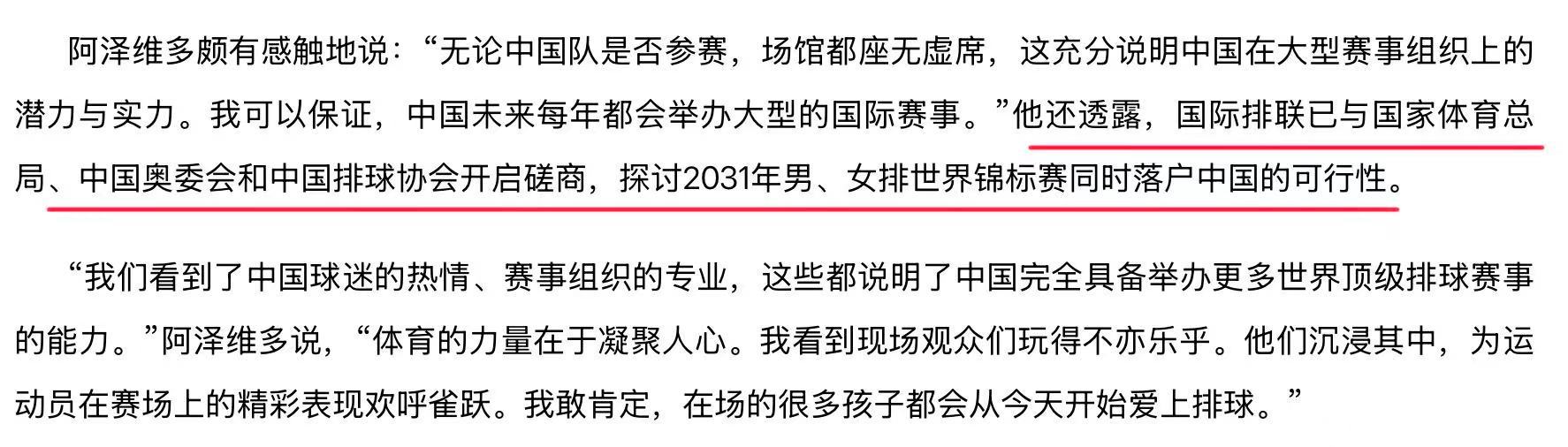 国际排联主席阿泽维多透露:国际排联已与国家体育总局、中国奥委会和中国排球协会开启磋商,探讨【2031年男、女排世界锦标赛】同时落户中国🇨🇳的可行性。国际排坛动态