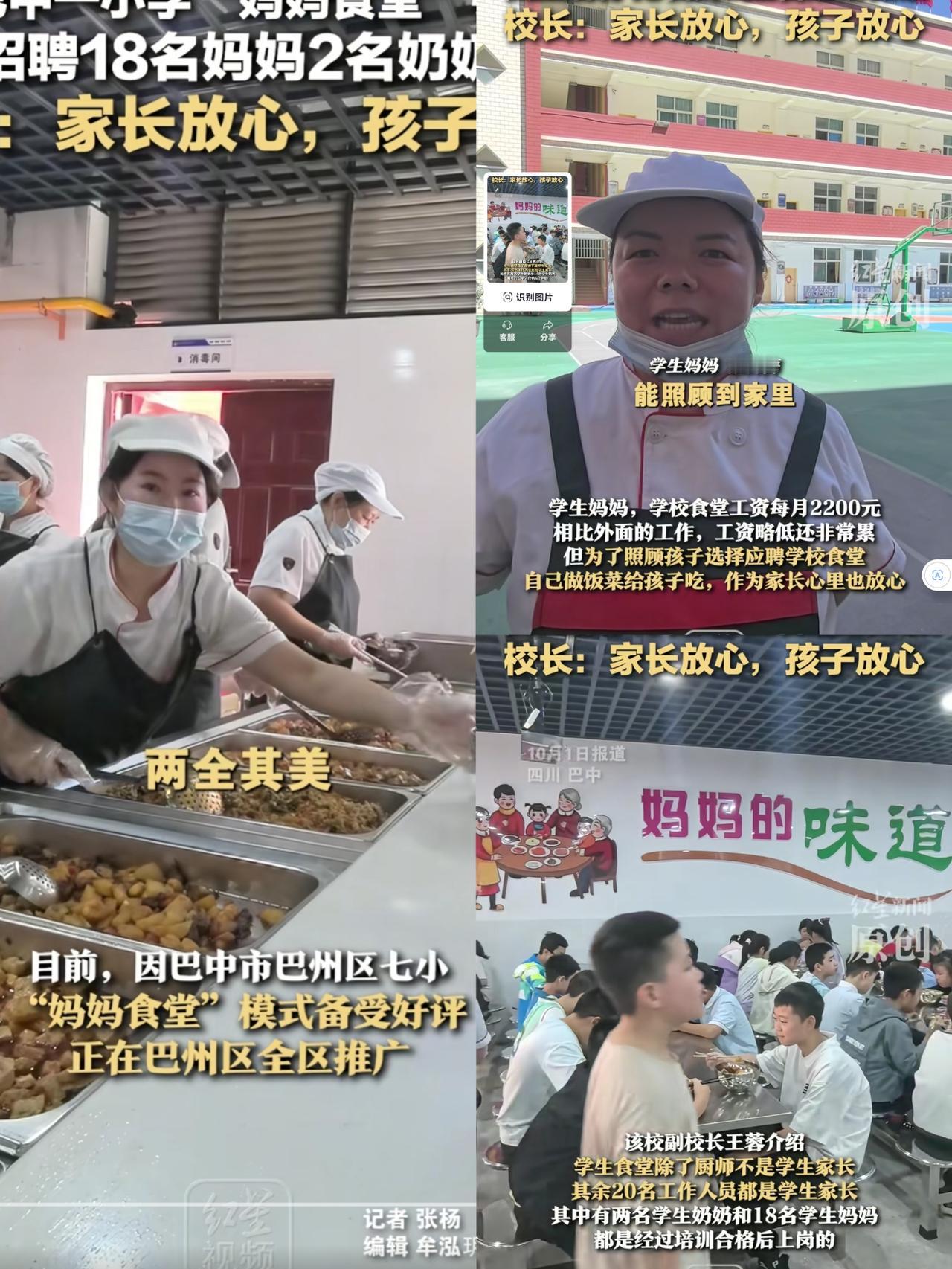 上海都头疼的学校食堂食品安全难题 竟被四川巴中一所小学漂亮解决啦! 人家搞的“妈妈食堂”,光听名字就 超暖心,安全感爆棚。 学校请了18位妈妈和2名奶奶来食堂工作 既解决家长就业,又保障孩子饮食健康 一举两得。这可比那些只盯着利润的外来招标方靠谱多了 妈妈们可都是一心为孩子。 据说巴中要在全市推广 真心希望各地学校都学学 大家觉得这“妈妈食堂”模式咋样? 快在评论区唠唠!