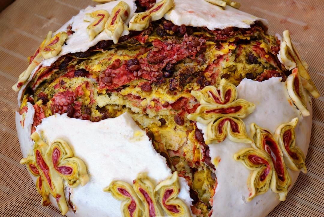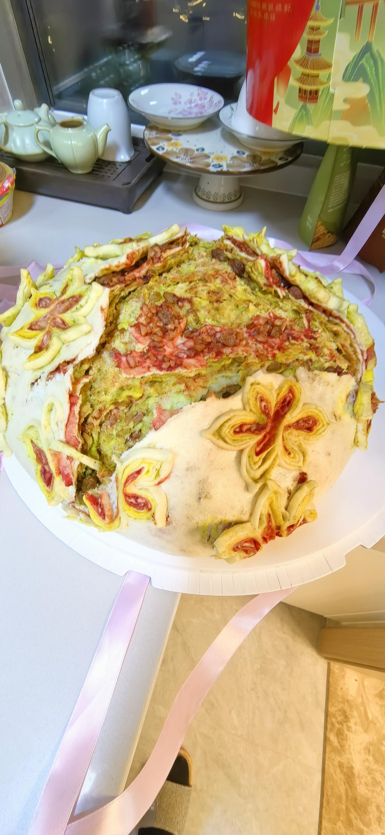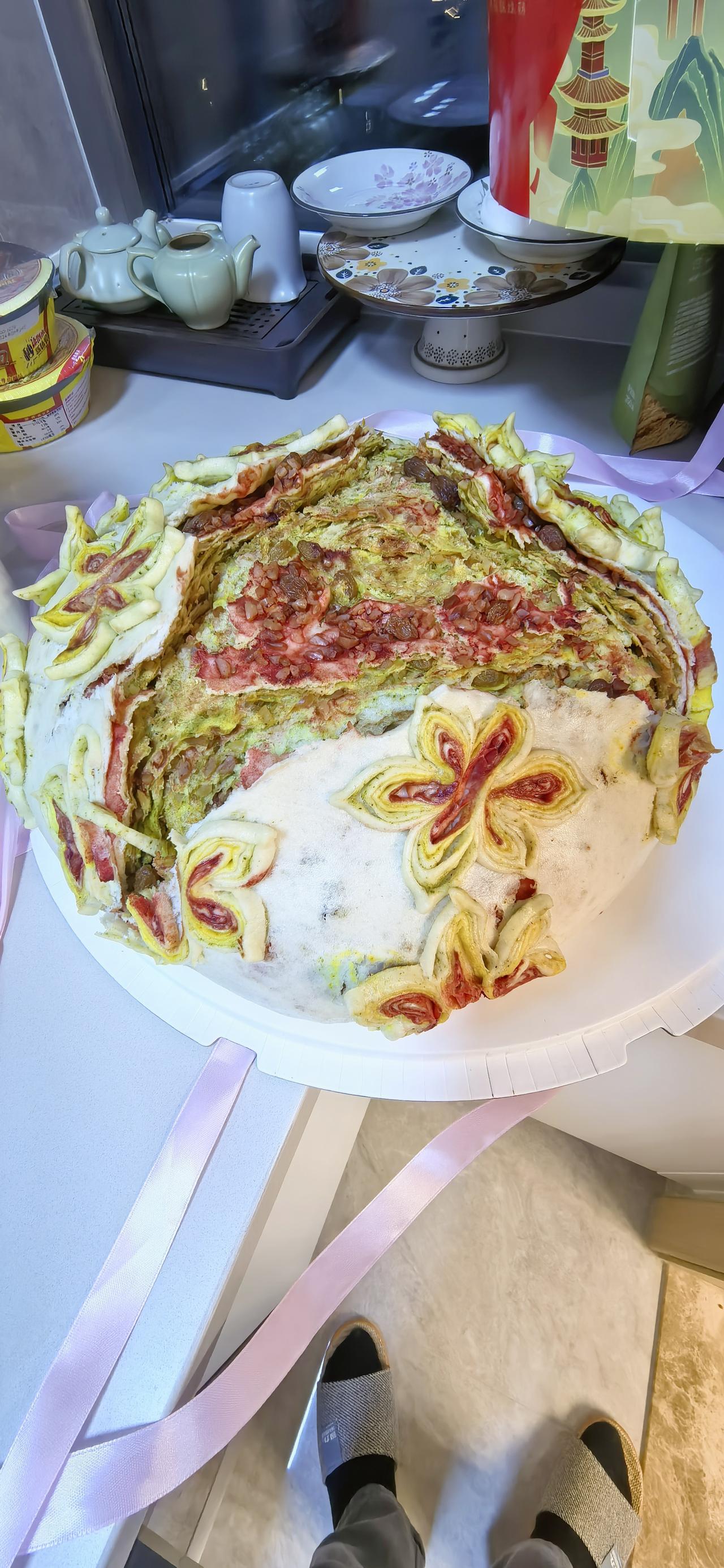 中秋节的大月饼是青海人最馋的记忆! 在月饼界,青海大月饼是个特别的存在。当广式月饼在烤箱里焦香流油时,它正静静地在蒸笼里酝酿着一场面食艺术的绽放。 这不是普通的月饼——它是一个直径堪比盘子的“巨人”,一层香豆粉、一层红曲、一层姜黄,在巧手妇人反复揉擀中叠出十层八层的绚烂。每一刀切下,都是大地上长出的色彩在绽放。 最妙的是顶上那朵面花。小时候,我们总偷偷掰下那朵蟠桃或腾龙,惹得大人追着嗔怪。如今,月饼上刻着“团圆”“丰收”,每一刀都是对日子最直白的祝福。 这哪里是月饼?分明是青海人把对土地的眷恋、对团圆的执念,都揉进了一团面里。中秋夜,当别处都在切分小巧的月饼时,青海人家正分享着这份独一无二的、带着蒸笼温度的幸福。 这份藏在面粉里的浪漫,是机器永远复刻不了的手工温度。大月亮月饼 吃货大月饼 秋日生活打卡季