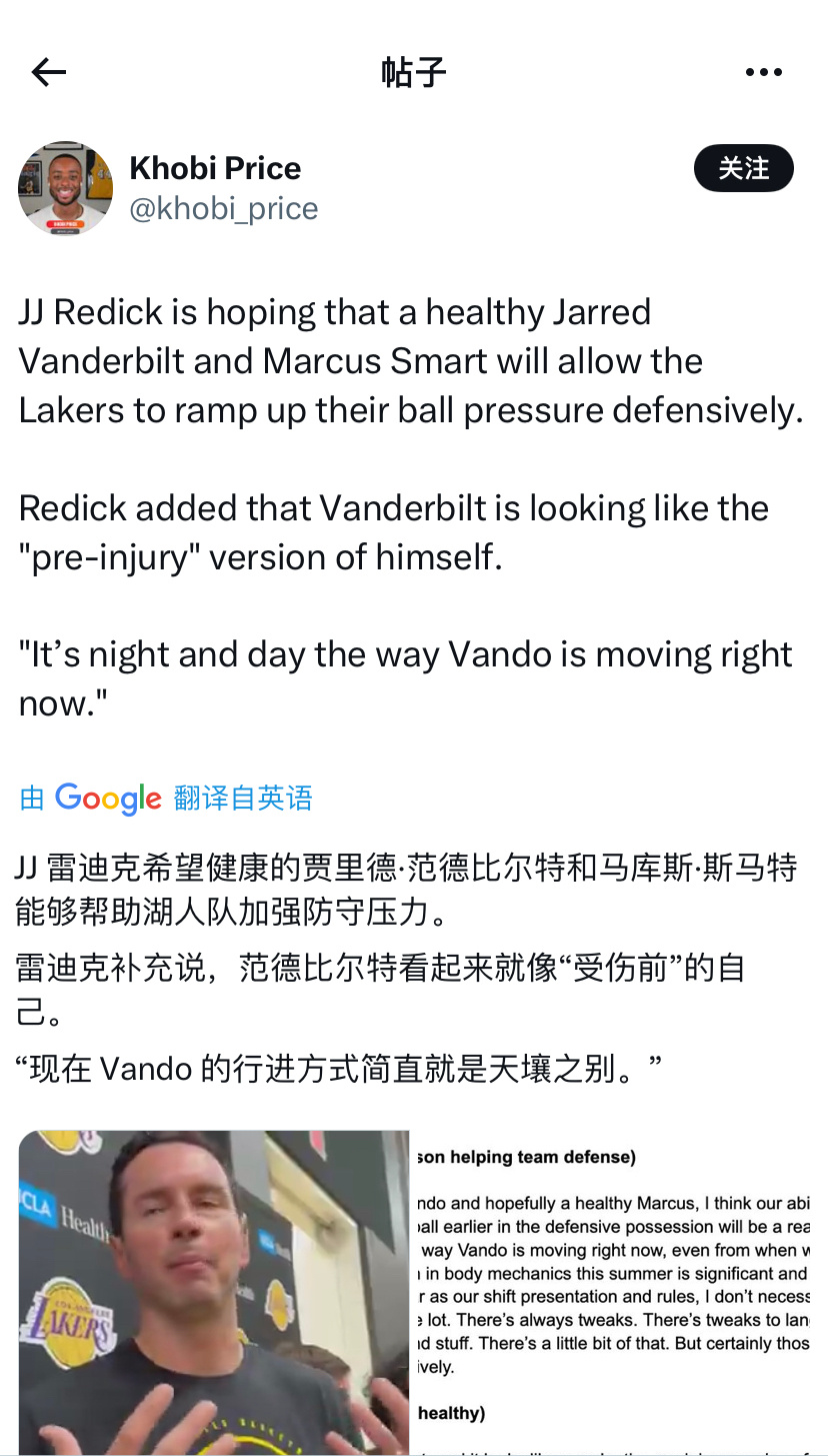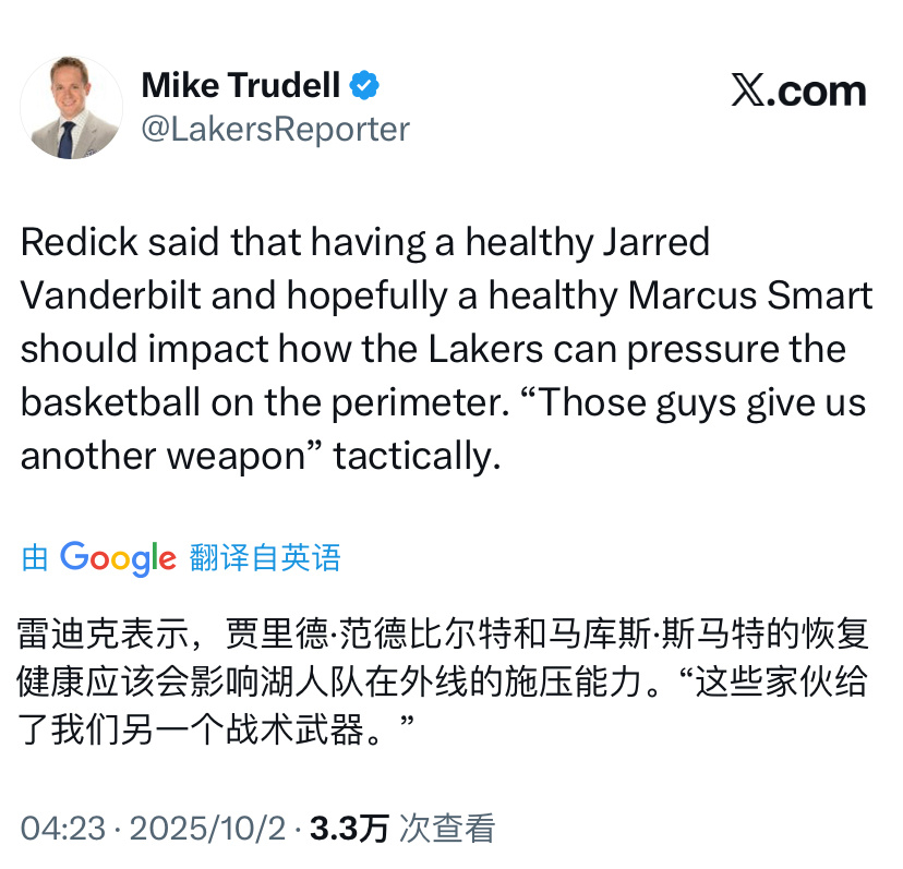雷迪克希望健康的彪哥和马库斯·斯马特能够帮助湖人队加强防守压力。这些家伙给了我们另一个战术武器。