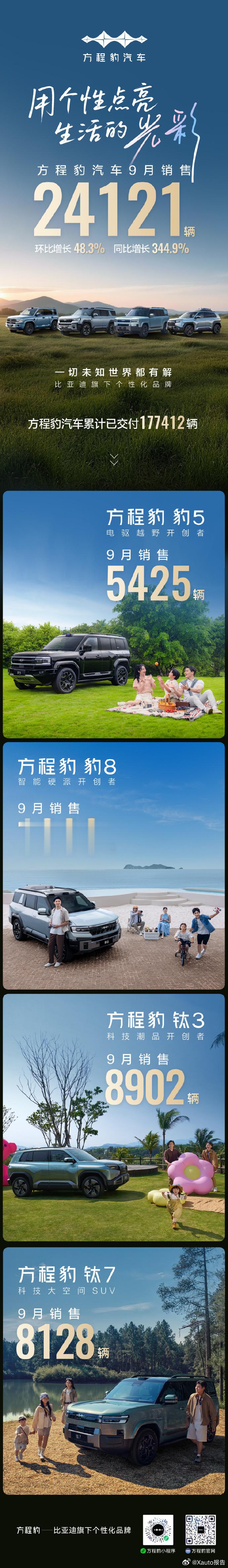 方程豹汽车 9月销售24121辆,环比增长48.3%,同比增长344.9%。