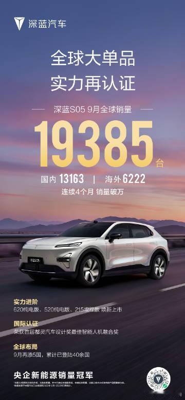深蓝S05已连续4个月销量破万,9月全球热销19385台。