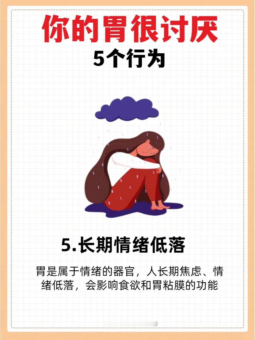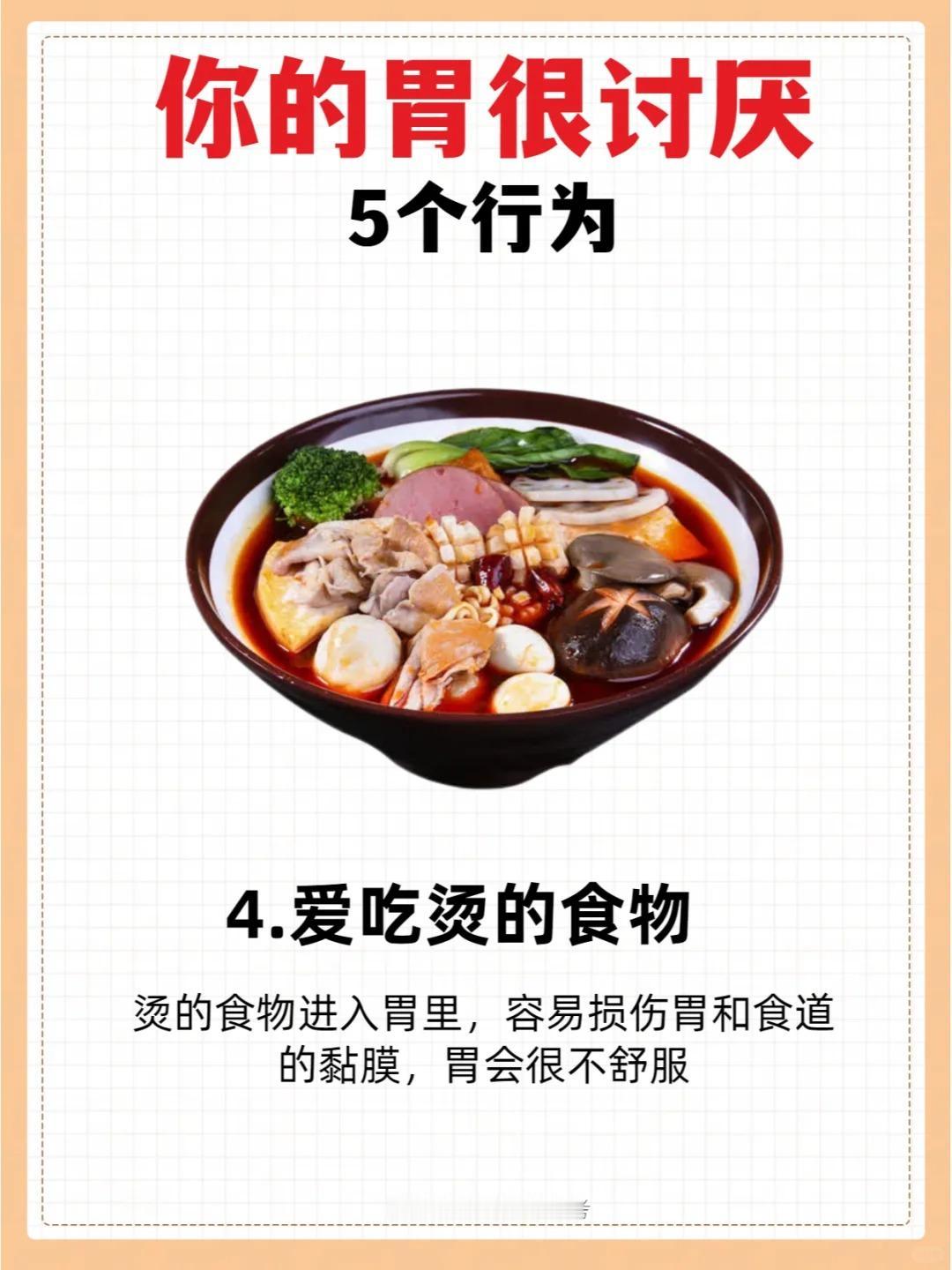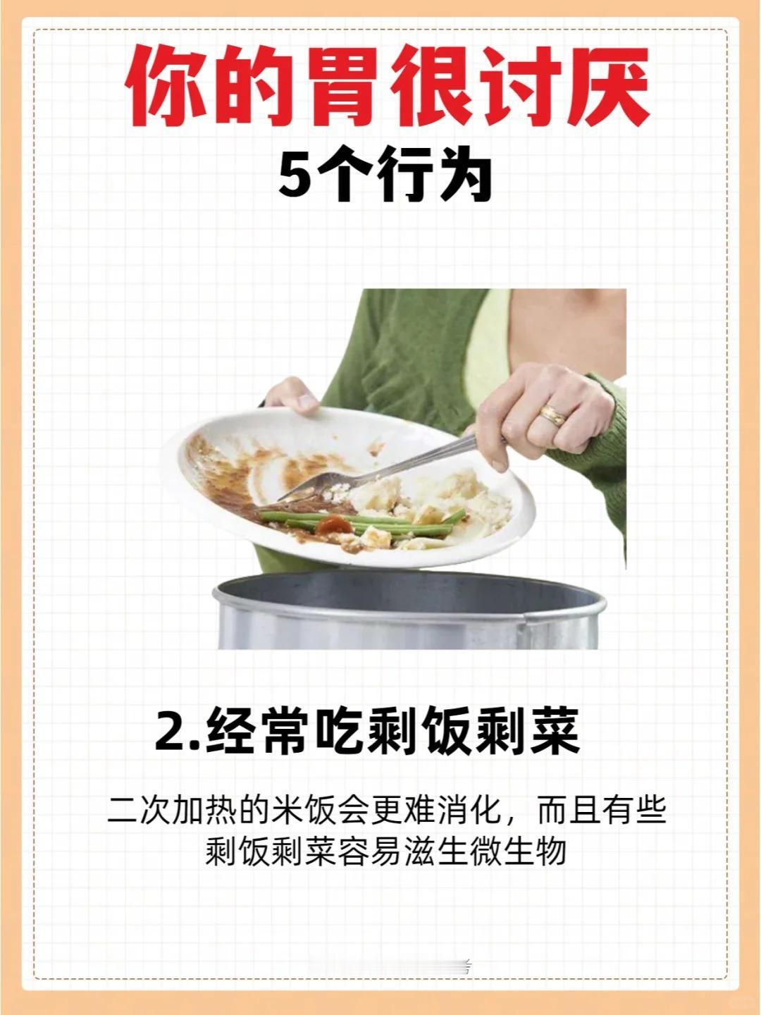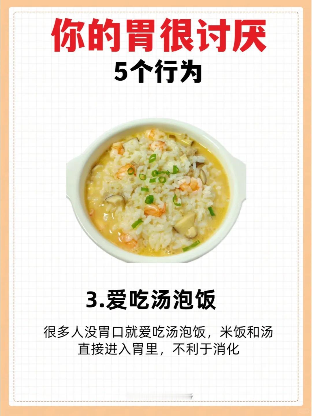 你的胃很讨厌这5个行为! 1.吃饭太快 2.常吃剩饭剩菜 3.爱吃汤泡饭 4.爱吃烫的食物 5.长期情绪抑郁