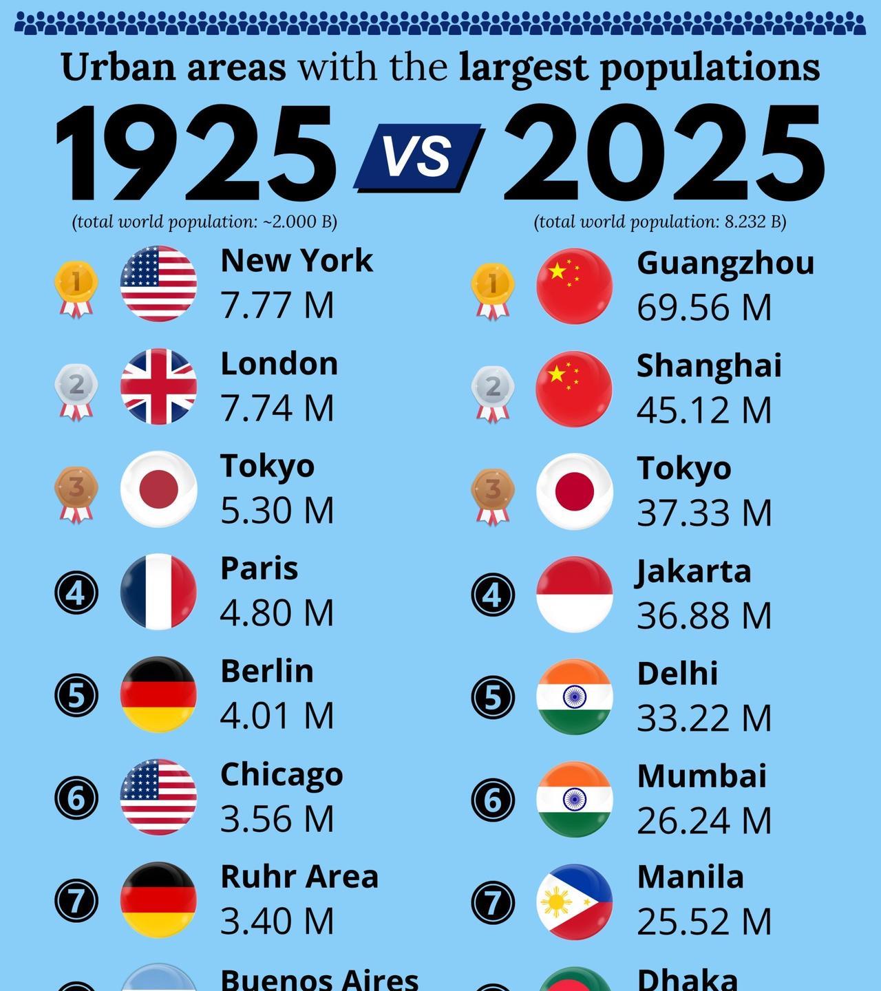根据2025年《人口统计学》数据,2025年世界八个人口最多的城市地区与百年前(1925年)人口最多的城市地区比较: 2025年,世界总人口82.32亿,前八人口最多的城市地区: 1925年,世界总人口20亿左右,前八人口最多的城市地区: