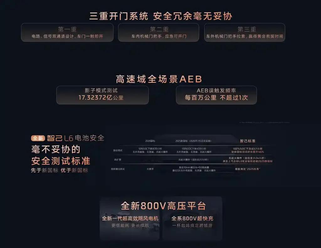 新车强调全域安全体系,全系标配灵蜥爆胎稳定控制系统,宣称可在200毫秒内识别爆胎并介入控制。电池安全标准覆盖2026年国标,车身采用“十纵十横”笼式结构,关键部位使用热成型硼钢。智己官方数据显示,其电池系统累计装车超10万台,目前未发生自燃事故。