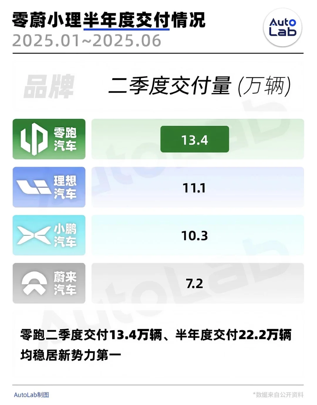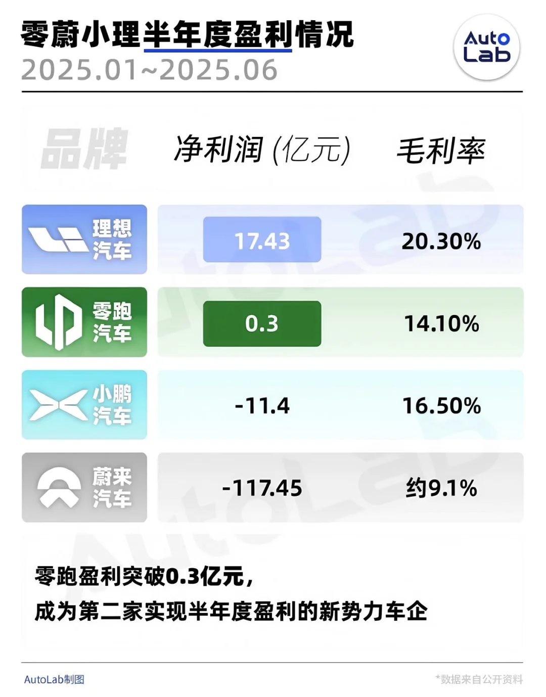 对比了下四大港股新势力的二季度财报,和大家分享一下其中有意思的点: [一R]盈利能力: 零跑在当季度实现了1.6亿元的净利润,这是继2024年第四季度后再次实现单季度盈利,并成为中国造车新势力中第二家实现半年度盈利的企业是其本季度最重磅的亮点; 蔚来单车均价最高,但因高昂的换电、服务等体系成本,亏损最为严重; 小鹏虽有MONA系列爆款拉动销量,但仍未跨过盈利门槛。零跑则率先实现了“销量-盈利”的正向循环,这是其本季度最重磅的亮点。 [二R]交付量: 零跑以134,112辆的交付成绩成为造车新势力阵营中的季度交付量冠军,同比增长高达151.7%。不得不说做的非常成功; 理想的交付量同比增长不多,但L系列依然是重要的销量支撑; 小鹏的交付量同比大幅增长,MONA系列的助力明显; 蔚来虽然交付量绝对值暂居第四,但环比增长显著,且其多品牌战略(蔚来、乐道、firefly萤火虫)开始贡献销量。 [三R]海外出口: 上半年零跑出口量2万台,位居新势力第一。马来西亚工厂下线首车,欧洲市场稳步推进。 在“蔚小理”还主要聚焦国内市场竞争时,零跑凭借与Stellantis的合作,在全球化布局上已经抢占了先机,打开了新的增长天花板。 总的来说,零跑汽车在2025年第二季度的表现可圈可点,其通过高品价比的产品定位、持续优化的成本结构和日益显现的规模效应,成功实现了交付量的快速增长和盈利能力的显著提升。 国内市场近几个月表现都不错,周销也有超过特斯拉的优秀成绩。海外市场表现同时有拉升,8月超越比亚迪登顶德国纯电市场,不过比亚迪一直是出海头部国产品牌,不容小觑。 当然,零跑也面临一些挑战,主要是单车售价相对较低,影响了其总收入规模,以及需要在智能驾驶等核心技术领域持续加大投入以保持竞争力。 中国新势力格局已从“蔚小理”转变为 “理零鹏蔚” 。理想是利润之王,零跑是销量和效率之王,小鹏凭借技术下沉复苏最快,蔚来虽战略布局最广但仍处于转型阵痛期,面临最大财务压力。