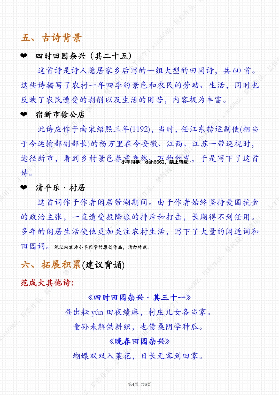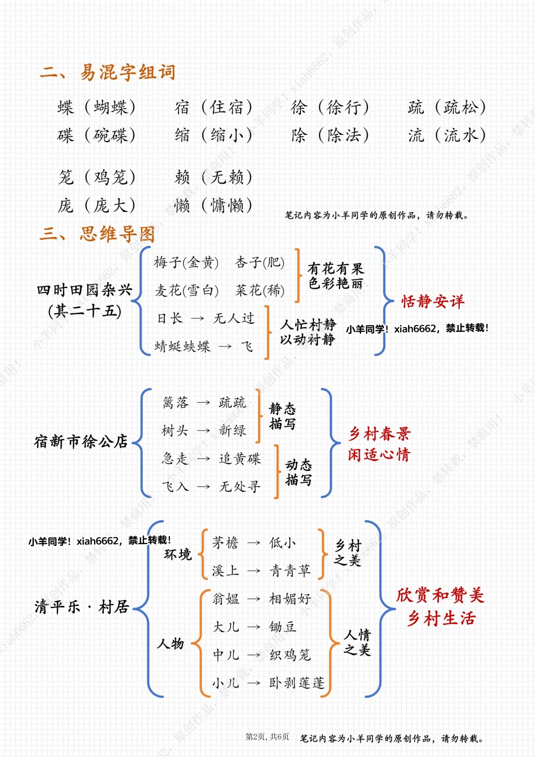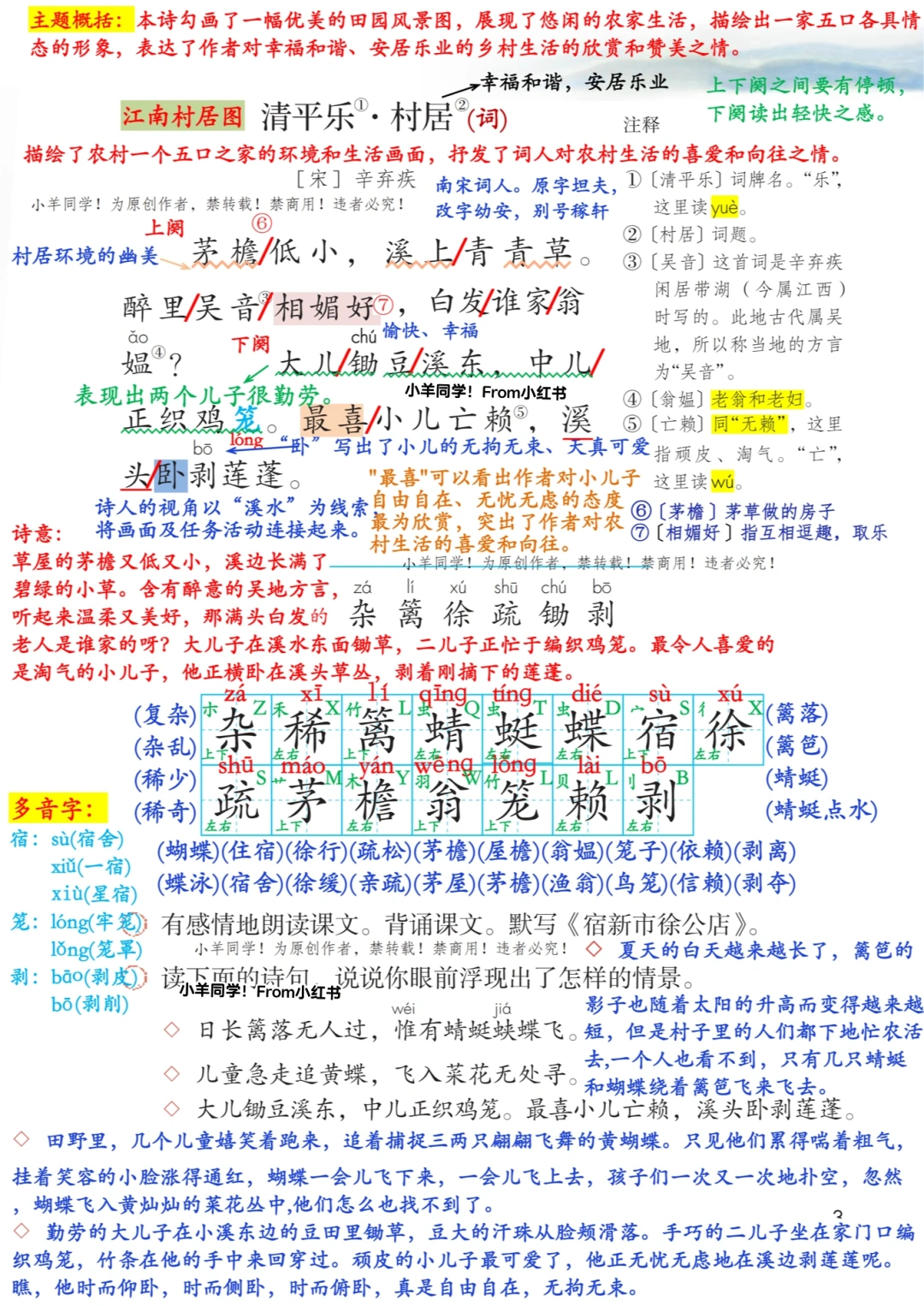 持续更新四下笔记…… 🌲 学习目标: 1️⃣认识“杂、篱”等6个生字,会写“杂、稀”等15个字。 2️⃣有感情地朗读课文,背诵课文。 3️⃣想象画面,能说出诗中描绘的情景。 4️⃣联系插画和注释、联系上下文、联系生活来理解诗词大意,体会作者对乡村生活的喜爱之情。