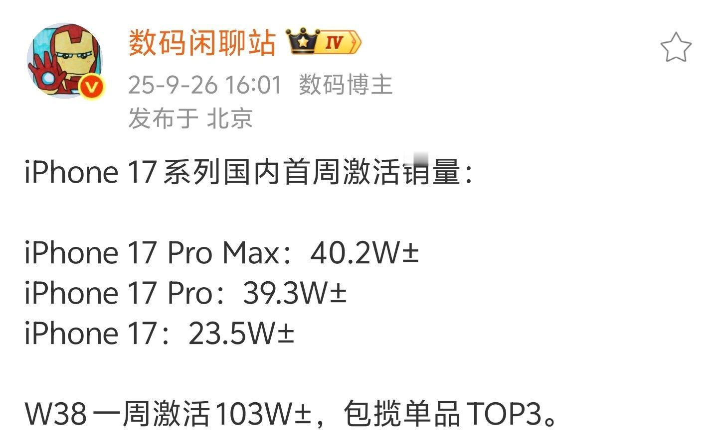 对比一下,iPhone17系列是首销三天激活量破百万。